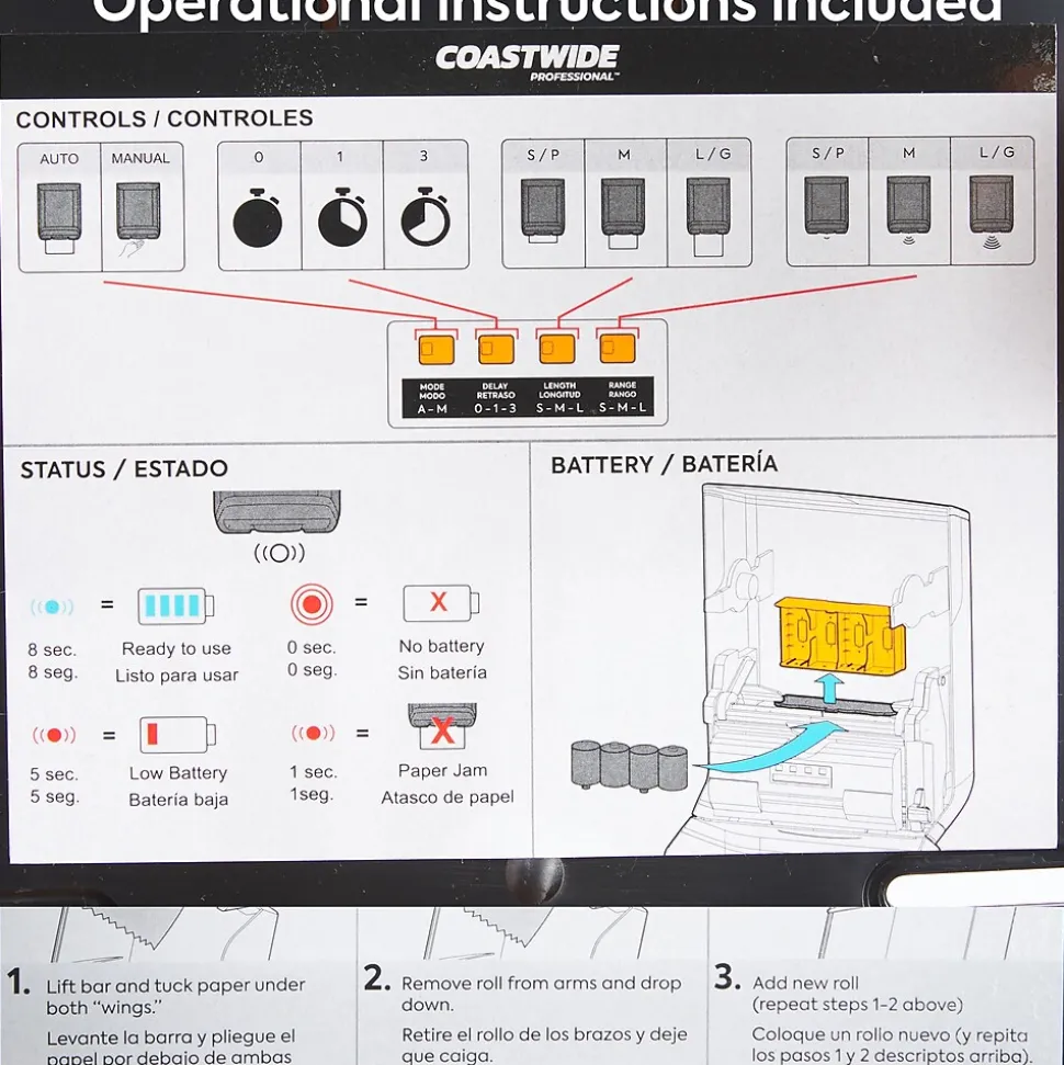 - Features push bar to manually dispense paper towels if batteries need to be changed