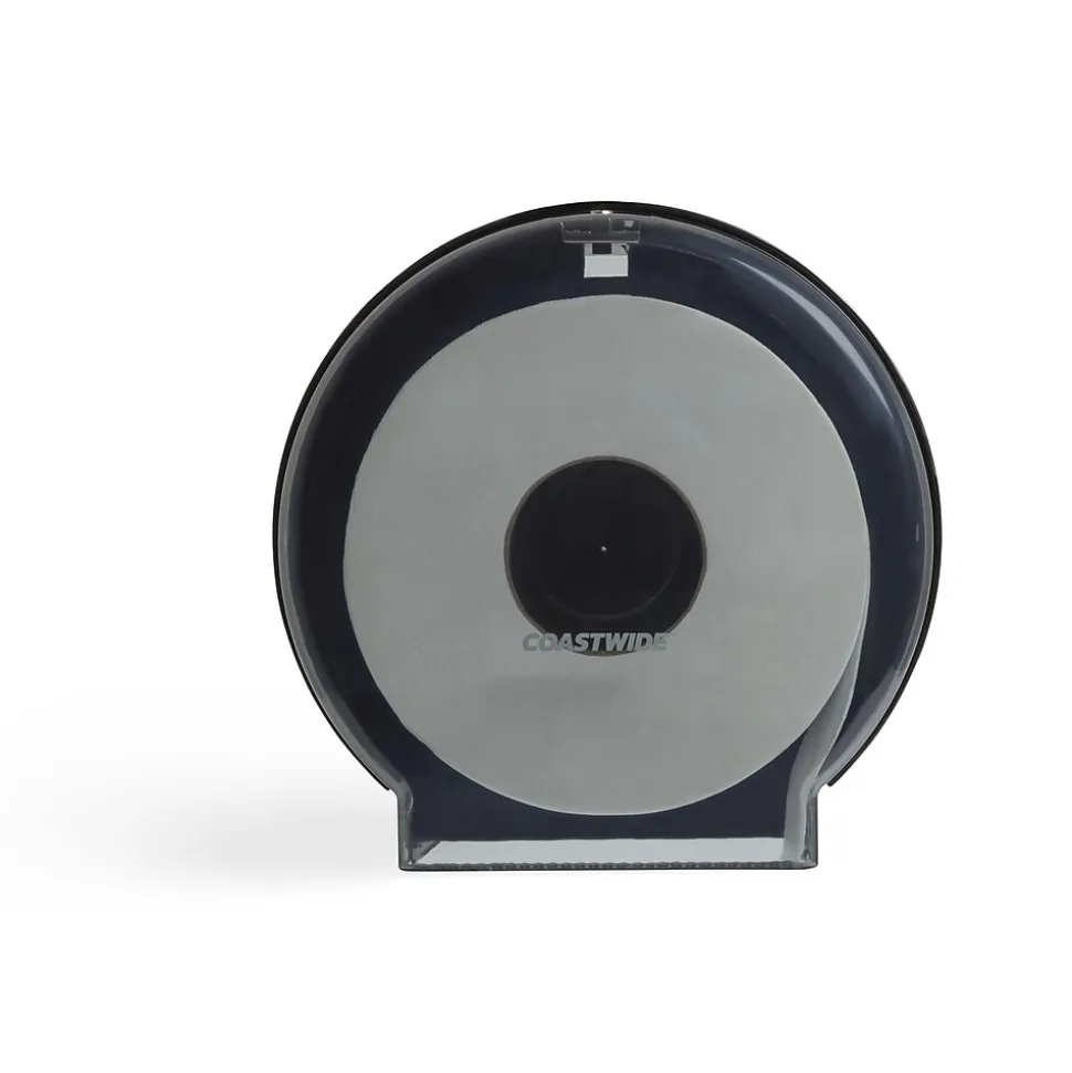 Mount this bath tissue dispenser in restrooms to hold jumbo rolls. This dispenser is made of shatter-resistant plastic for long-lasting durability, and the design keeps bath tissue clean and protected while providing easy access from the open area below. The tinted window lets you easily monitor the level of tissue inside, and two included keys make this dispenser lockable. This Coastwide Professional™ jumbo bath tissue dispenser is compatible with 9-inch jumbo-sized rolls with standard 3-inch cores.