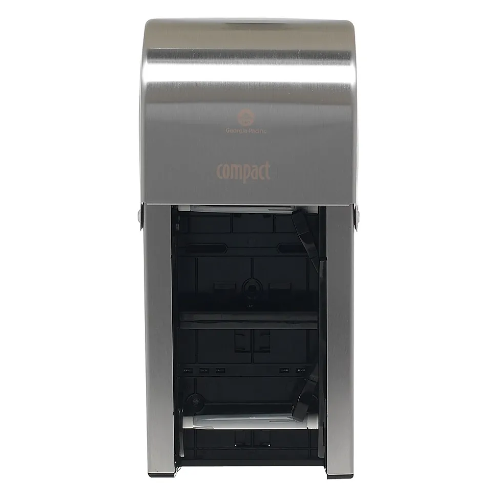 Compact® coreless toilet paper dispensing systems answer key needs for facilities managers when it comes to toilet paper for the restrooms. These high capacity systems help you avoid running out between service intervals and help reduce maintenance time typically spent changing out conventional toilet paper rolls. These systems save up to 95% in packaging waste compared to GP PRO’s standard roll toilet paper by eliminating stub-rolls, corrugate cores, paper roll wraps and the outer cardboard shipping case. And because the Compact® case has a smaller footprint, it requires less storage space. Compact® coreless toilet paper dispensers are designed to give the facility high capacity for continuous service. GP PRO is a division of Georgia-Pacific Consumer Products. We deliver well-designed, durable and easy-to-maintain professional solutions to meet the handwashing and cleaning needs for a range of business applications.