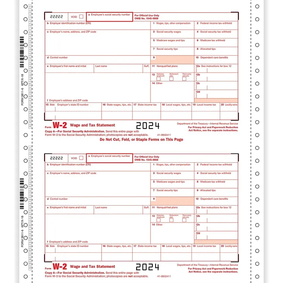 - 6-part, 2-up: Employer Copies A, 1/D, B, C, 2, 1/D