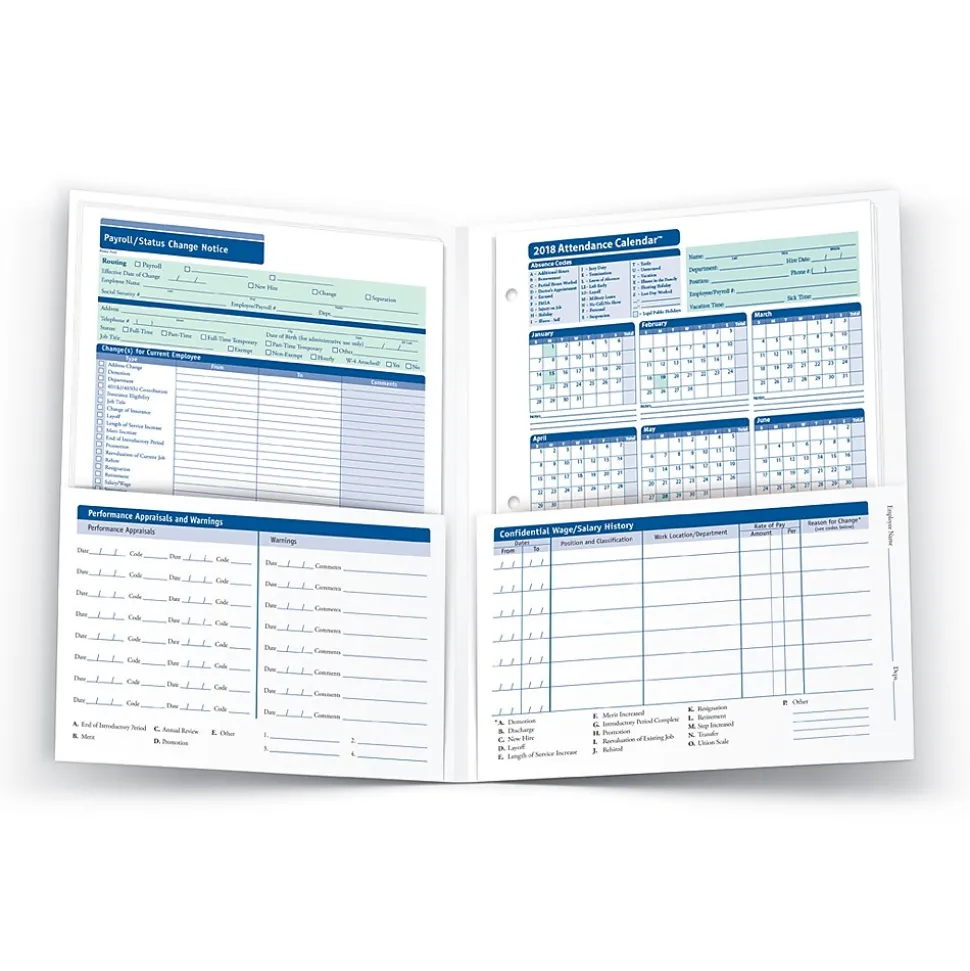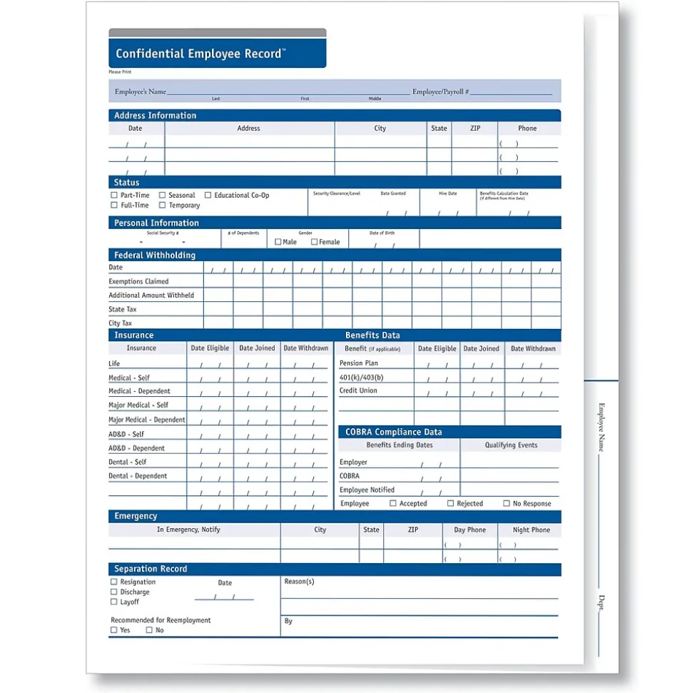 The ComplyRight confidential employee records folder complies with state and federal recordkeeping laws and makes it easy to record, store and file important employee data.