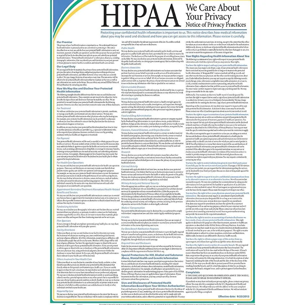 ComplyRight HIPAA Notice of privacy practices poster measures 12″ x 18″ and is laminated for durability. Poster communicates mandatory HIPAA rules to patients.