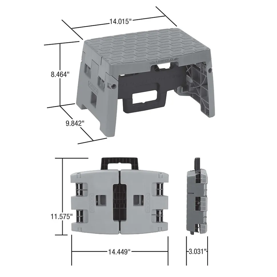 COSCO 1 step molded folding step stool is ideal for any task around the house. Whether it’s reaching that high cabinet, changing a light bulb or washing the windows, this step stool makes it easier to get any job done. This Type 1A, 300 lb. weight capacity lightweight step stool provides security and stability for any situation. The folding feature to this step stool allows for easy transportation and storage.