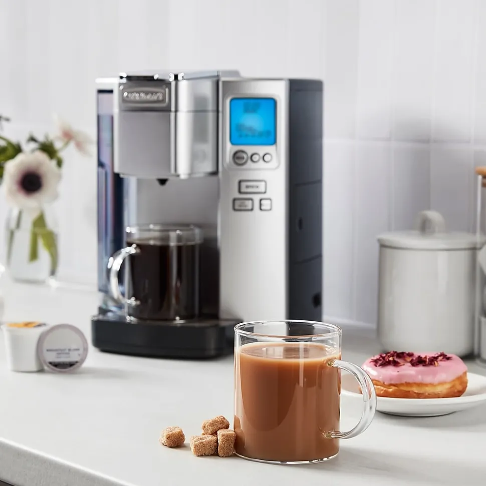 The 72 oz. capacity Cuisinart Premium Single-Serve Brewer is a fully programmable and versatile home-brewing unit that is ideal for both personal use and entertaining, making it perfect for any household. Compatible with any brand of single cup pod including Keurig K-Cup pods and equipped with the HomeBarista Reusable Filter Cup, this coffeemaker makes it easier than ever for consumers to enjoy a wide array of hot beverages. The unit has five different cup-size settings (ranging from 4 ounces to 12 ounces), and an adjustable brewing temperature to ensure desired temperatures are reached. In addition to coffee, a hot water button can be used to prepare soup, tea, hot cocoa, and more, and the unit is equipped with a rinse function for easy cleaning.