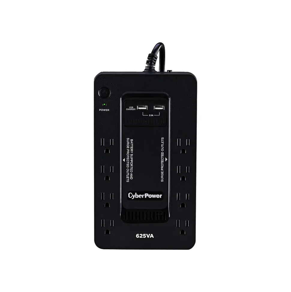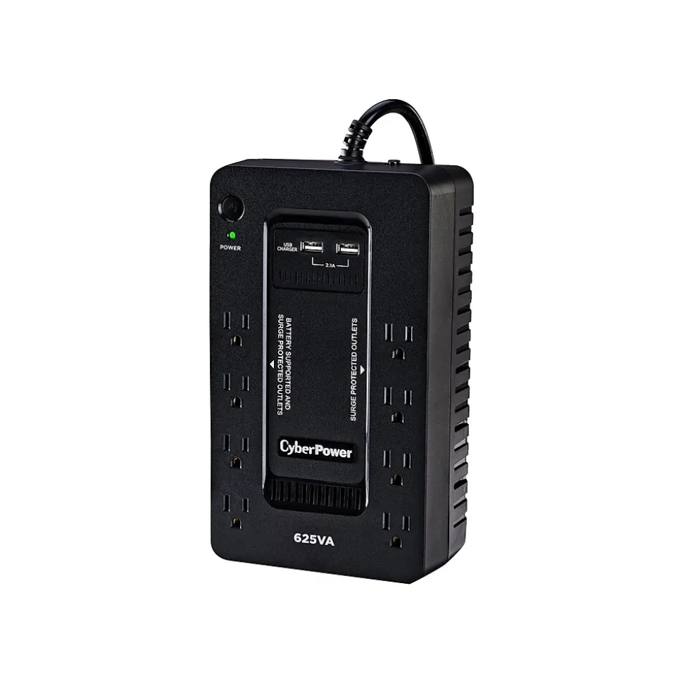 The CyberPower ST625U uninterruptible power supply (UPS) system provides battery backup and surge protection for lightning-induced surges and other power events that can damage electronic equipment. This unit delivers enough battery backup to power connected electronics through utility power failure and enough runtime to perform a graceful shutdown to protect against the loss of data and damage to valuable electronics during longer outages. The ST625U has two USB charging ports with 2.1 amp shared total output which gives you a faster charging time. This unit is designed to minimize noise for a quieter work environment and to run efficiently to reduce power consumption. Including a sleek design, this UPS is perfect for all your home office and entertainment needs, including computers, gaming consoles, and broadband routers.