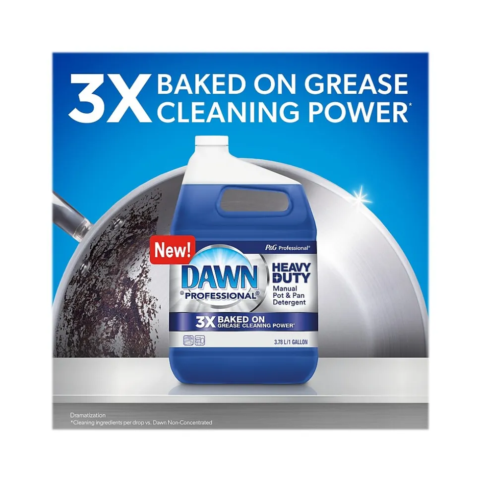 Experience three times the baked-on grease cleaning power with Dawn Professional’s Heavy Duty manual pot and pan dish detergent, the advanced and powerful Dawn Professional formula. Made for your toughest jobs, this heavy-duty dish soap saves you time and effort with 50% less scrubbing from active ingredients that do more of the work for you. This means less time presoaking, less time scrubbing, and more time back to you.
