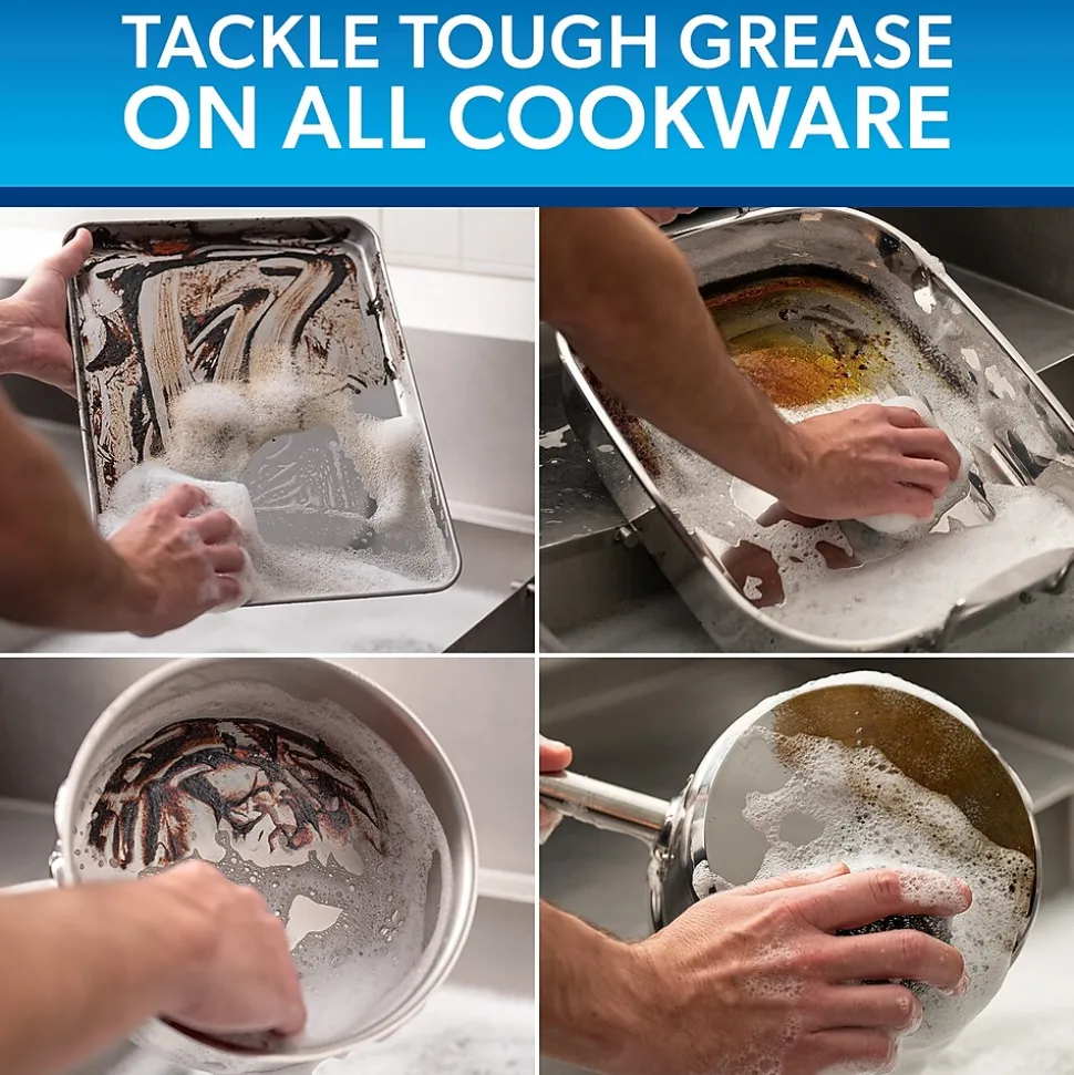 - Cuts through the toughest jobs such as baked/caked-on grease, dried eggs, tomato sauce, butter, potatoes, beans, and more throughout your kitchen