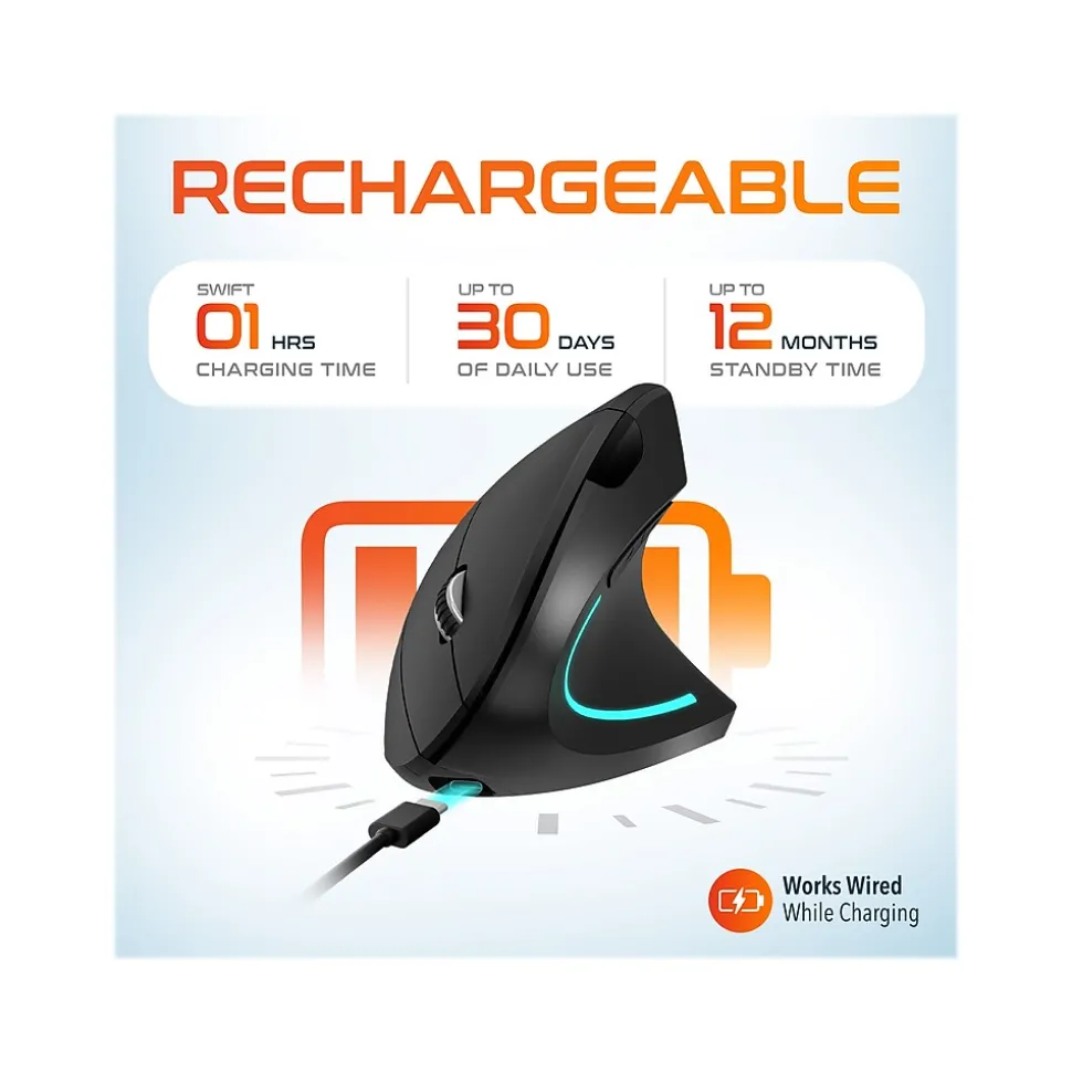 The Delton Ergonomic 12 Vertical Wireless Mouse has been redesigned with power users like you in mind. Remove wrist and arm strain from your day to day work and avoid long term health problems associated with prolonged mouse activity. The Delton Ergonomic 12 Vertical Wireless Mouse is specifically designed to keep your wrist and arm at a more natural angle. This prevents forearm pronation (crossing of your arm bones) that happens with traditional mouse usage and reduces strain on your wrist. This simple but revolutionary design change nearly eliminates strain on your wrist and arm and makes prolonged projects, gaming sessions, and other computer experiences enjoyable once again. Our digital precision technology, adjustable accuracy, 6-button design (including scroll wheel) makes work or play a breeze.