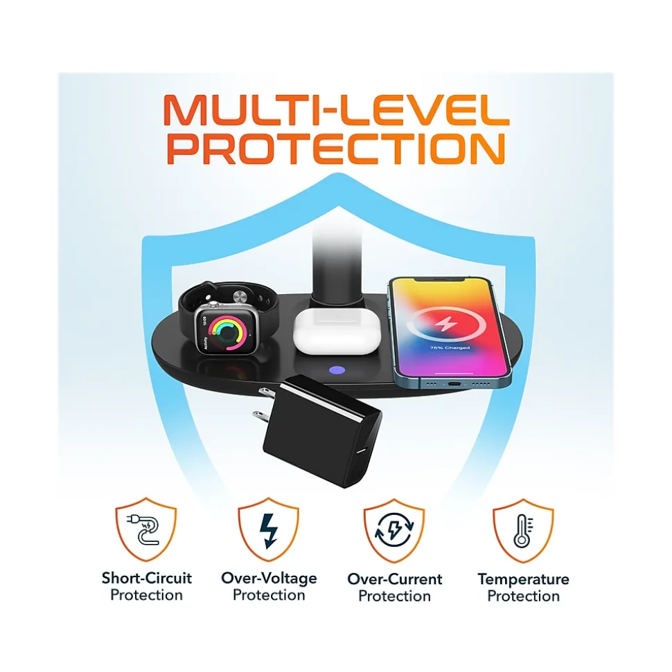 Streamline your workspace with the Delton HS1 innovative headset stand. Featuring an 11″ headset-holding arm and three wireless charging pads, it keeps your devices powered up and organized. With a sleek design, included 20W wall adapter, and top-notch safety certifications, it’s the perfect addition to your work-from-home office or corporate setting. Organize your desk and upgrade your charging experience today.