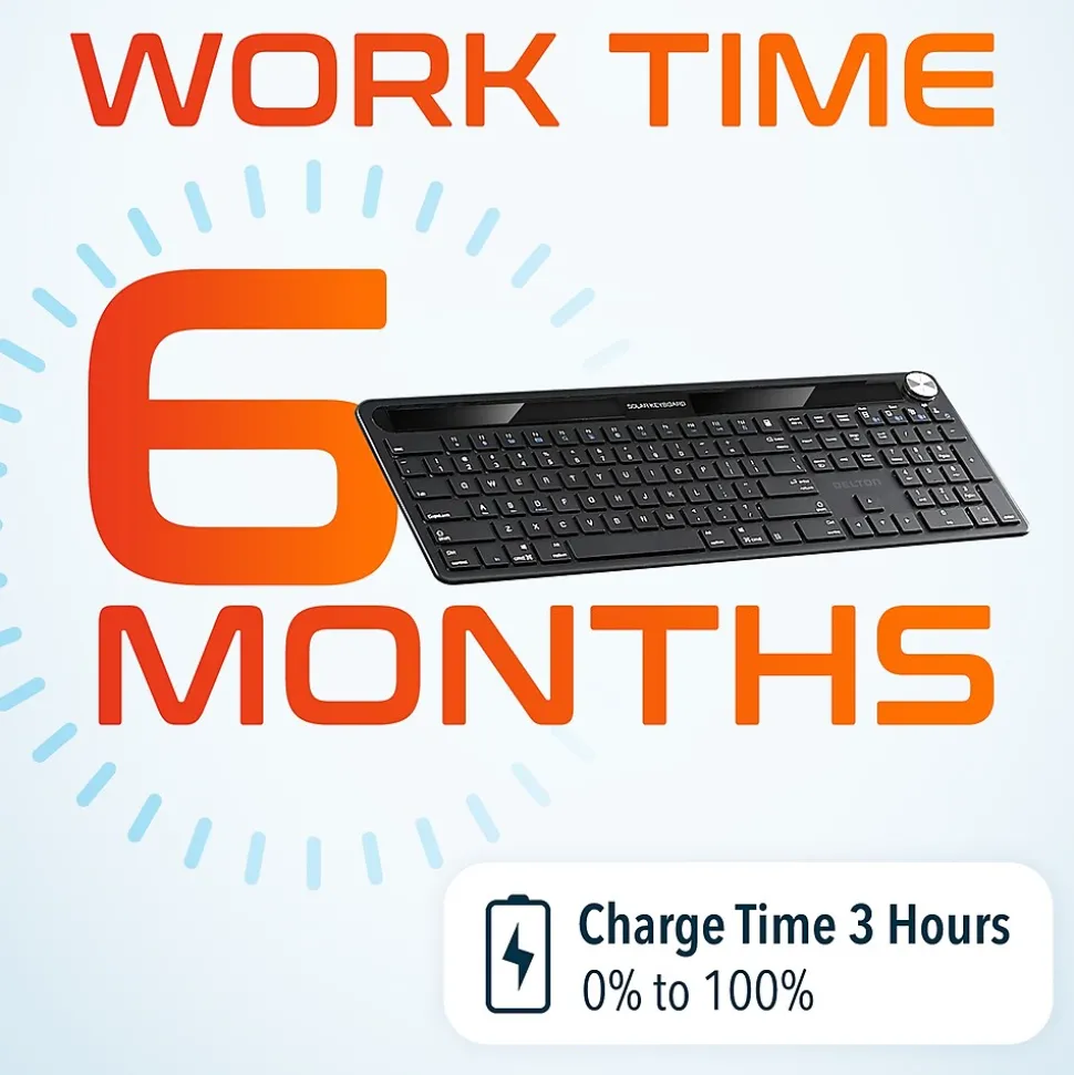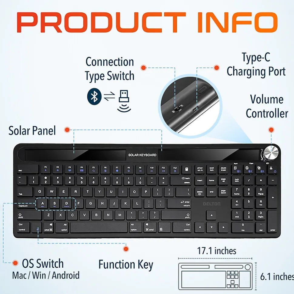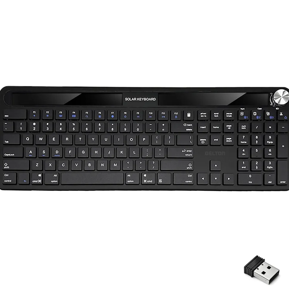 Experience the Delton KB90 wireless keyboard with dongle, a sustainable choice with the light-powered rechargeable capability that frees you from the cycle of disposable batteries. The 2.4GHz and Bluetooth wireless connectivity technologies guarantee a swift and stable connection, ensuring that every keystroke is instantly captured without lag. Designed for comfort and efficiency, this solar-powered wireless keyboard features a comprehensive 110-key layout, accommodating all standard typing needs. The silent keys of this wireless keyboard allow for a discreet typing experience, perfect for quiet offices or late-night work sessions. Integrated volume controls allow for easy sound adjustments without taking hands off the keyboard. The included auto-pair USB dongle means setup is straightforward and hassle-free. The sleek, low-profile keys look modern and contribute to faster and more accurate typing, enhancing your productivity.