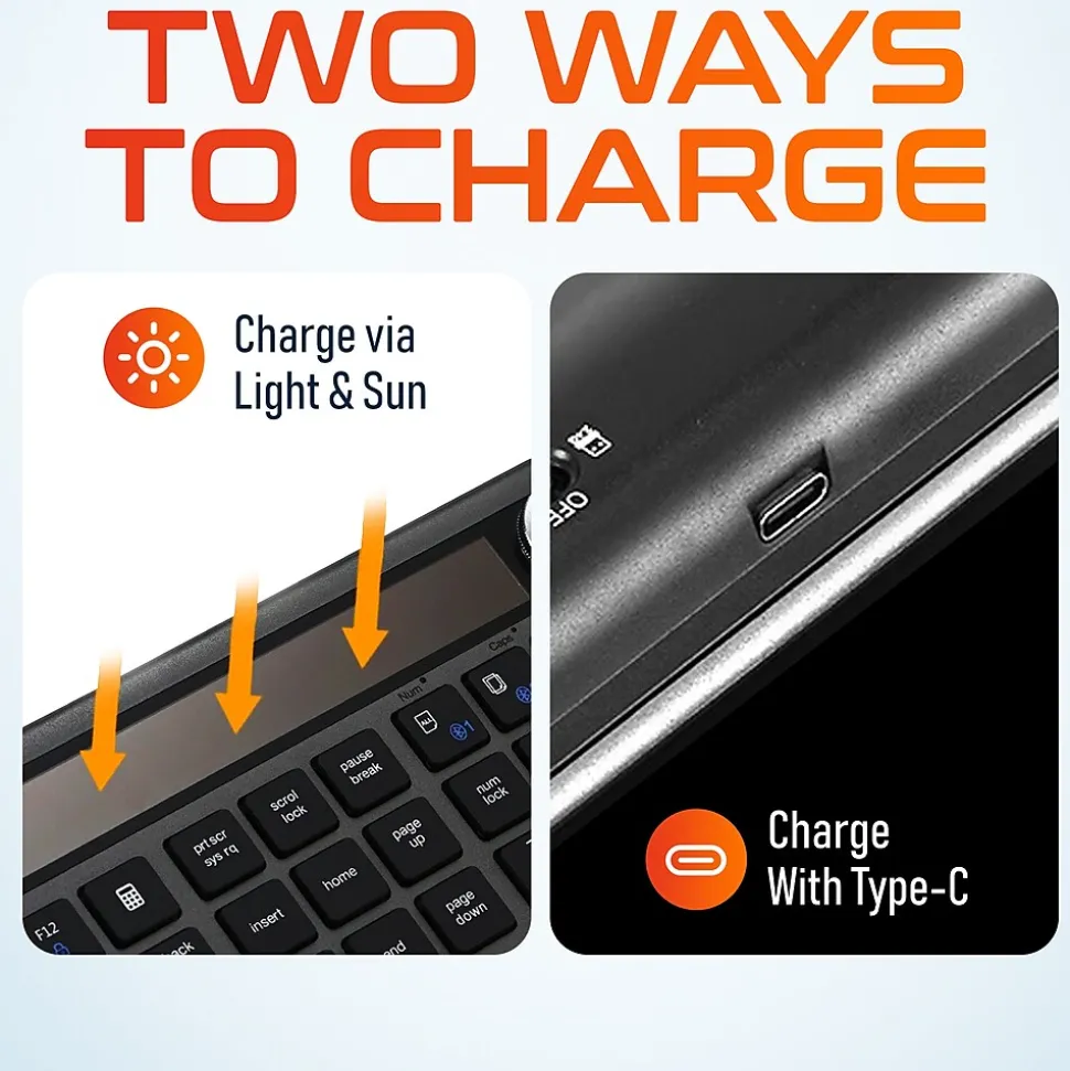 - Light/solar panel recharges the keyboard’s battery, eliminating the need for disposable batteries