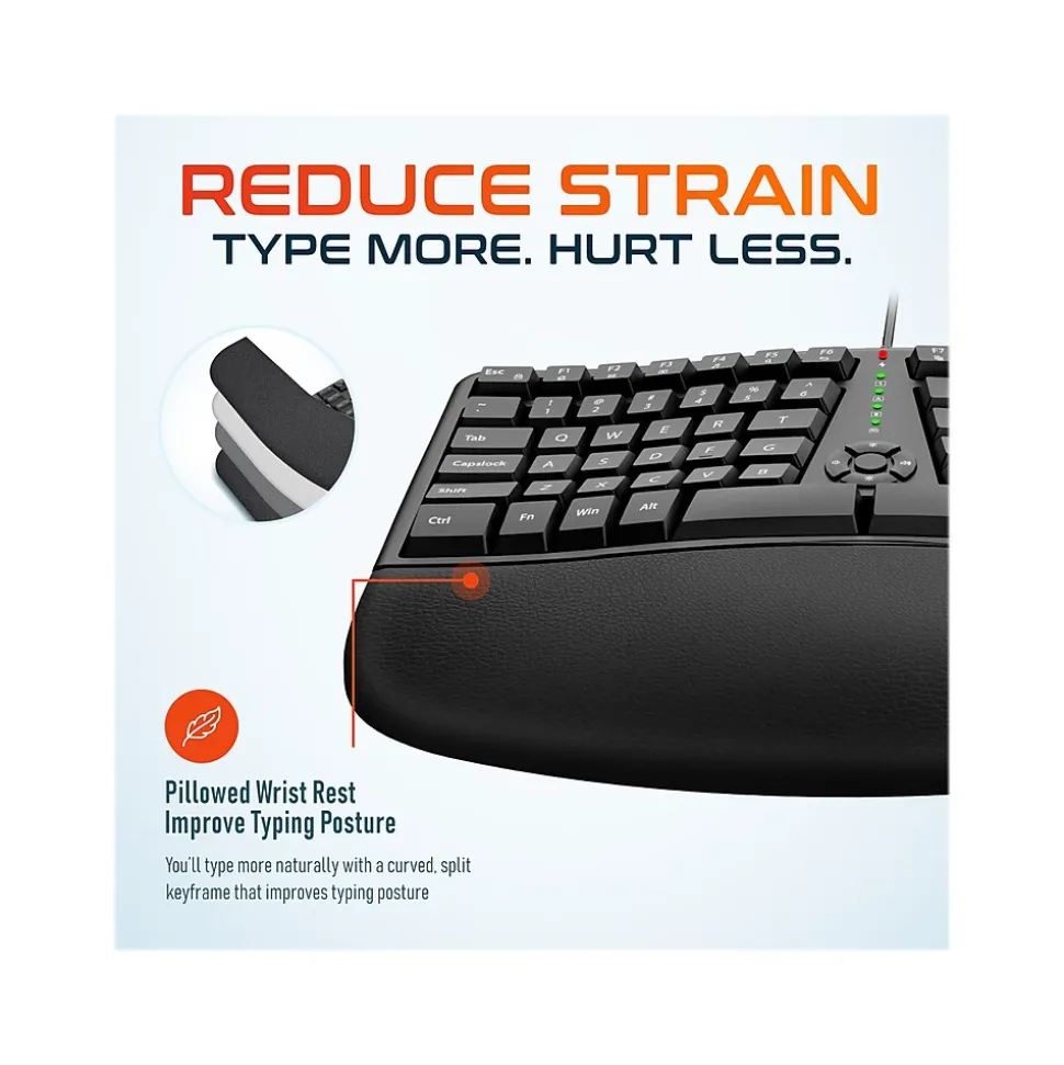 - In addition to the ergonomic design, the keyboard and mouse have a wrist-friendly design that reduces strain and is recommended by rheumatologists