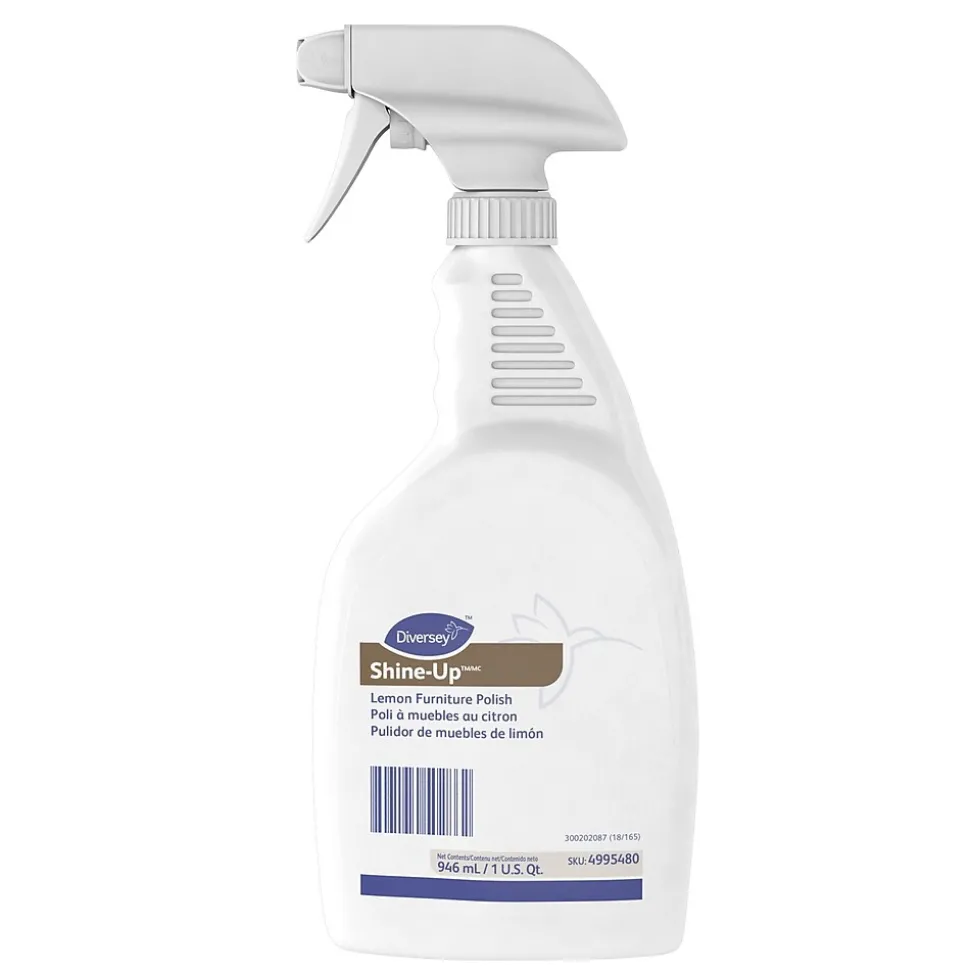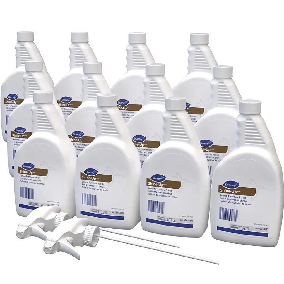 Clear away dust, smears, and fingerprints from wood furniture with this polishing cleanser. This 12-count box provides a steady supply of polish for large cleaning jobs, and each 32-ounce bottle has a spray nozzle for easy application. This Diversey Shine-Up furniture polish leaves a lemony scent behind for a fresh, clean fragrance that fills your room.