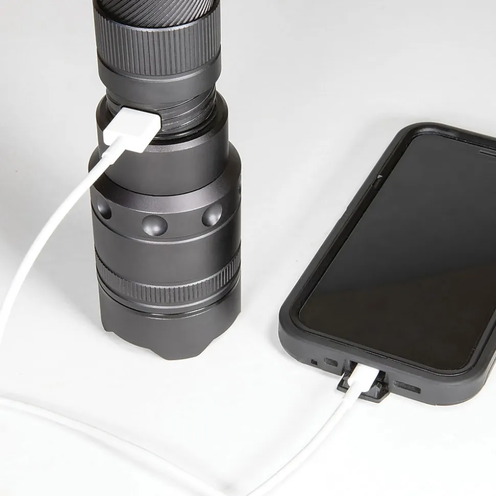 The Dorcy 4,000-Lumen Pro Series Rechargeable Aluminum Flashlight and Powerbank is convenient in emergencies because it is such a bright flashlight and can charge your electronic devices in times of emergency. The light is made of durable aluminum construction and is weather-resistant. It has an IPX4 water-resistant rating and is impact-resistant to 3.28 ft. It has a 5-hour run time on high and it yields an impressive 557 ft. beam distance.