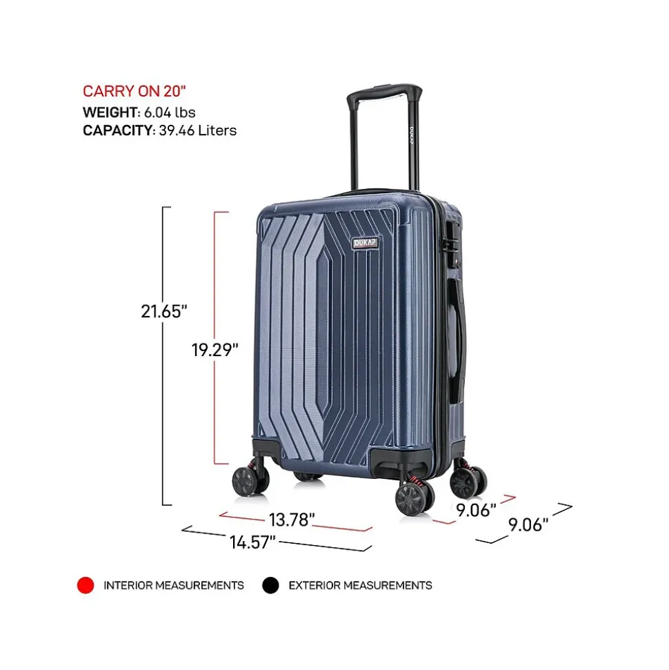 The hard-flex construction of this DUKAP STRATOS carry-on four-wheel spinner luggage offers maximum strength, durability, and a water-/scratch-resistant finish. It features a full interior fabric lining with a zipper compartment on one side and snap-on straps on the opposite side for easy packing.