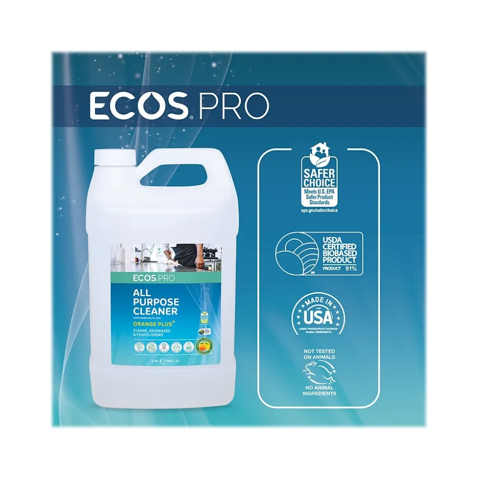 ECOS PRO Orange Plus is an all-purpose cleaner and degreaser that effectively lifts dirt, grime, scum, grease, and adhesive residue with the power of citrus plants. Use it to clean and fight odors on water-safe surfaces. This formula is made using sustainable, plant-powered ingredients. Made without dyes; gray water and septic safe. Features a refreshing citrus scent. Recognized by US EPA’s Safer Choice (DfE) and USDA’s BioPreferred program.