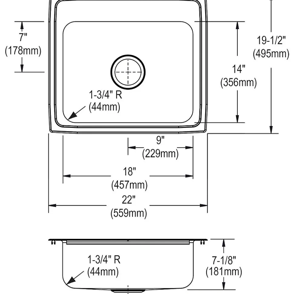 Elkay Celebrity Stainless Steel 22″ x 19-1/2″ x 7-1/8″, Single Bowl Top Mount Sink PSR22193