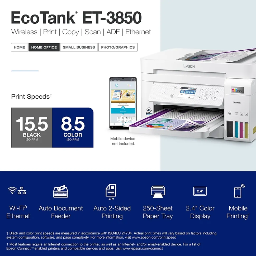 Your busy office needs a printer that’s fast, affordable, easy to use, and has great features. That’s why we developed the EcoTank ET-3850 – an innovative cartridge-free solution that uses high-capacity, easily refillable ink tanks. So you’ll worry less about running out of ink, and save a lot on replacement ink. The ET-3850 features an auto document feeder, fast printing with outstanding print quality, productive paper handling, a high-resolution flatbed scanner, and a large color display – making it the perfect printer for your home office.