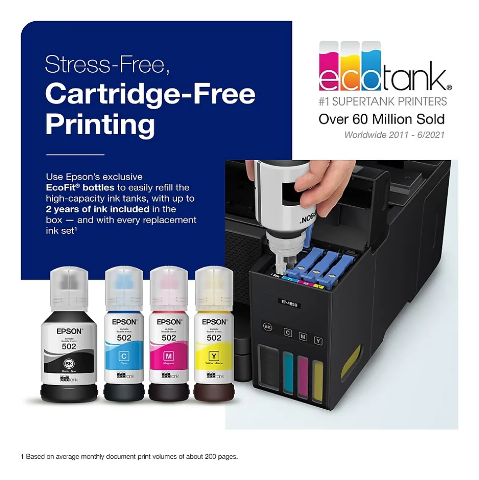 | Series or Collection | EcoTank ET-4850 all-in-one, manual, power cord, 1 bottle of 502® Black (127 mL) and 1 bottle each of 502 Cyan, Magenta, Yellow (70 mL) |
