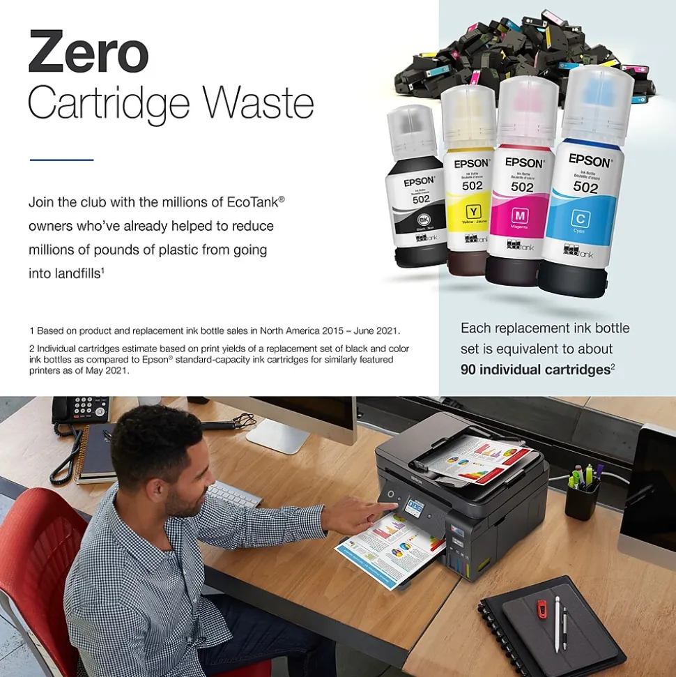 - Zero Cartridge Waste – By using an EcoTank printer, you can help reduce the amount of cartridge waste ending up in landfills