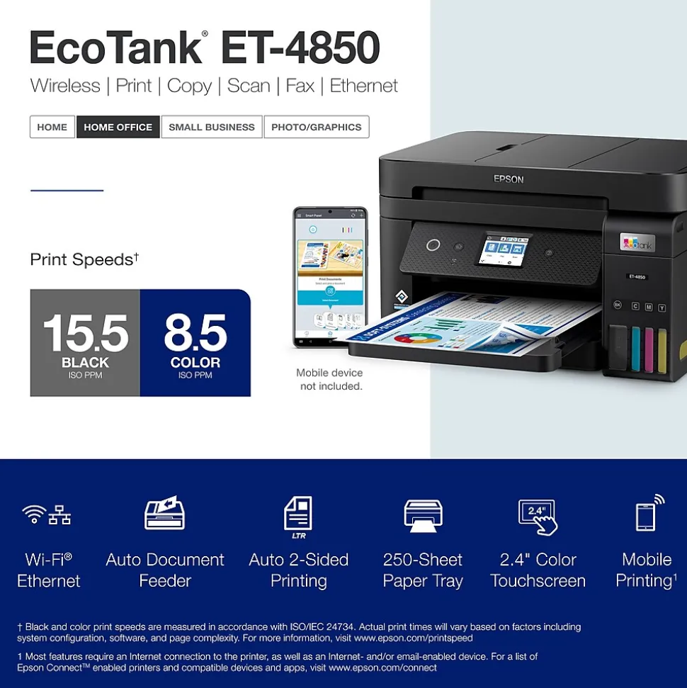 Your business needs a printer that’s fast, affordable, easy to use, and has premium productivity features. That’s why we developed the EcoTank ET-4850 – an innovative cartridge-free solution that uses high-capacity, easily refillable ink tanks. So you’ll worry less about running out of ink, and save a lot on replacement ink. The ET-4850 offers fax, productive paper handling, a high-resolution flatbed scanner, and convenient 2.4″ color touchscreen – making it the perfect printer for your office.