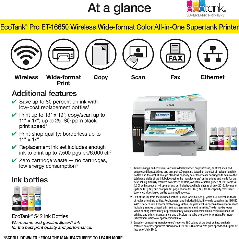 | Display Screen Size (Inches) | EcoTank Pro ET-16650, power cord, 1 bottle of 542 Black ink (127 mL) and 1 bottle each of 542 Cyan, Magenta, Yellow (70 mL), CD-ROM for product setup |
