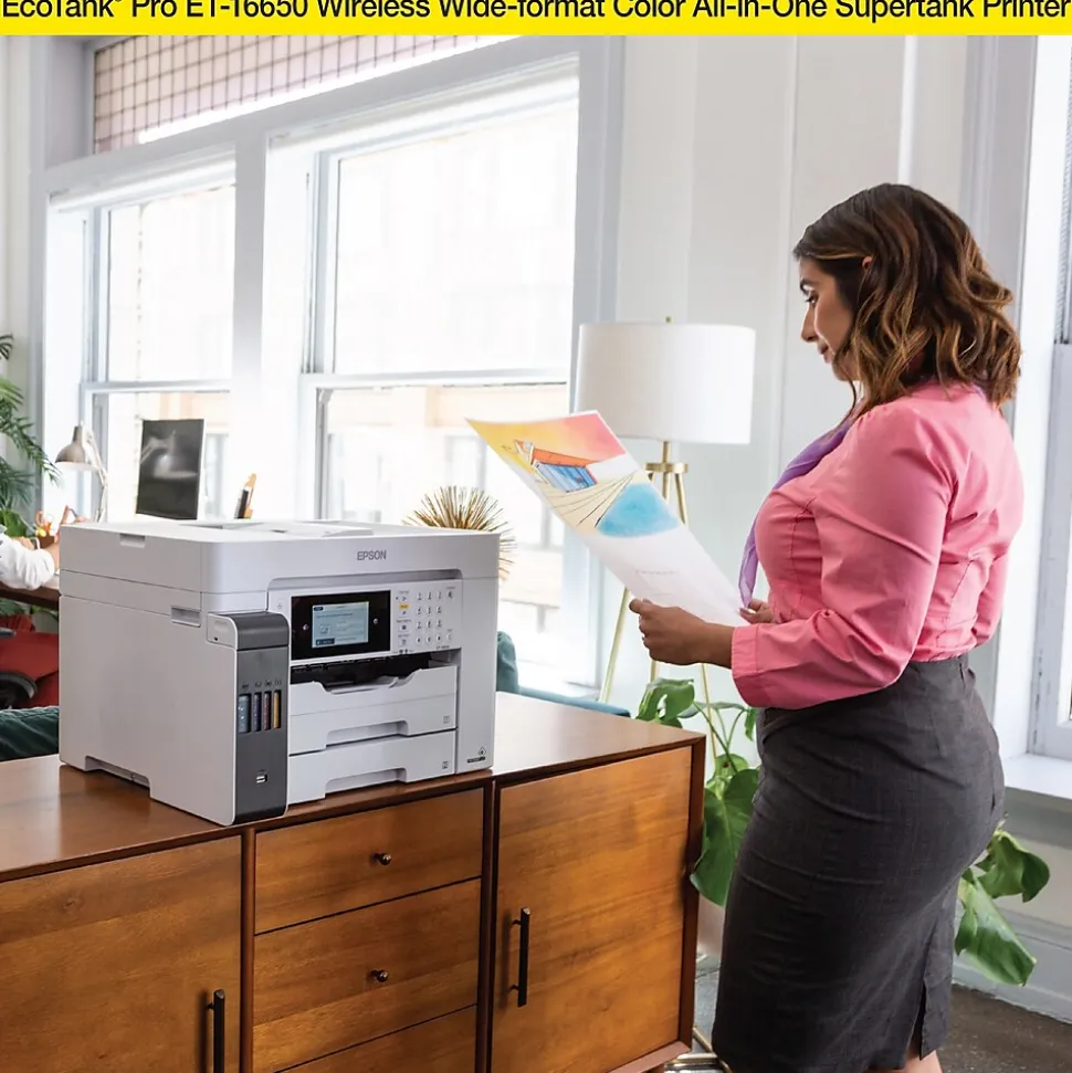 The wide-format EcoTank Pro ET-16650 wireless all-in-one offers fast Cartridge-Free Printing with easy-to-fill supersized ink tanks. You can save up to 80 percent with low-cost replacement ink bottles vs. standard-capacity color laser toner cartridges – about 2 cents per color ISO page versus 14 cents with cartridges. PrecisionCore Heat-Free Technology delivers high-volume, print-shop-quality output. This all-in-one with Epson DURABrite pigment-based ink delivers vibrant prints up to 13″ x 19″ and scans up to 11″ x 17″. Each replacement ink set included enough ink to print up to 6,000 pages. Plus, there’s zero cartridge waste and very low energy consumption. The ET-16650 features a 500-sheet front tray paper capacity and rear specialty-paper feed, plus a 4.3″ color touchscreen and hands-free voice-activated printing.