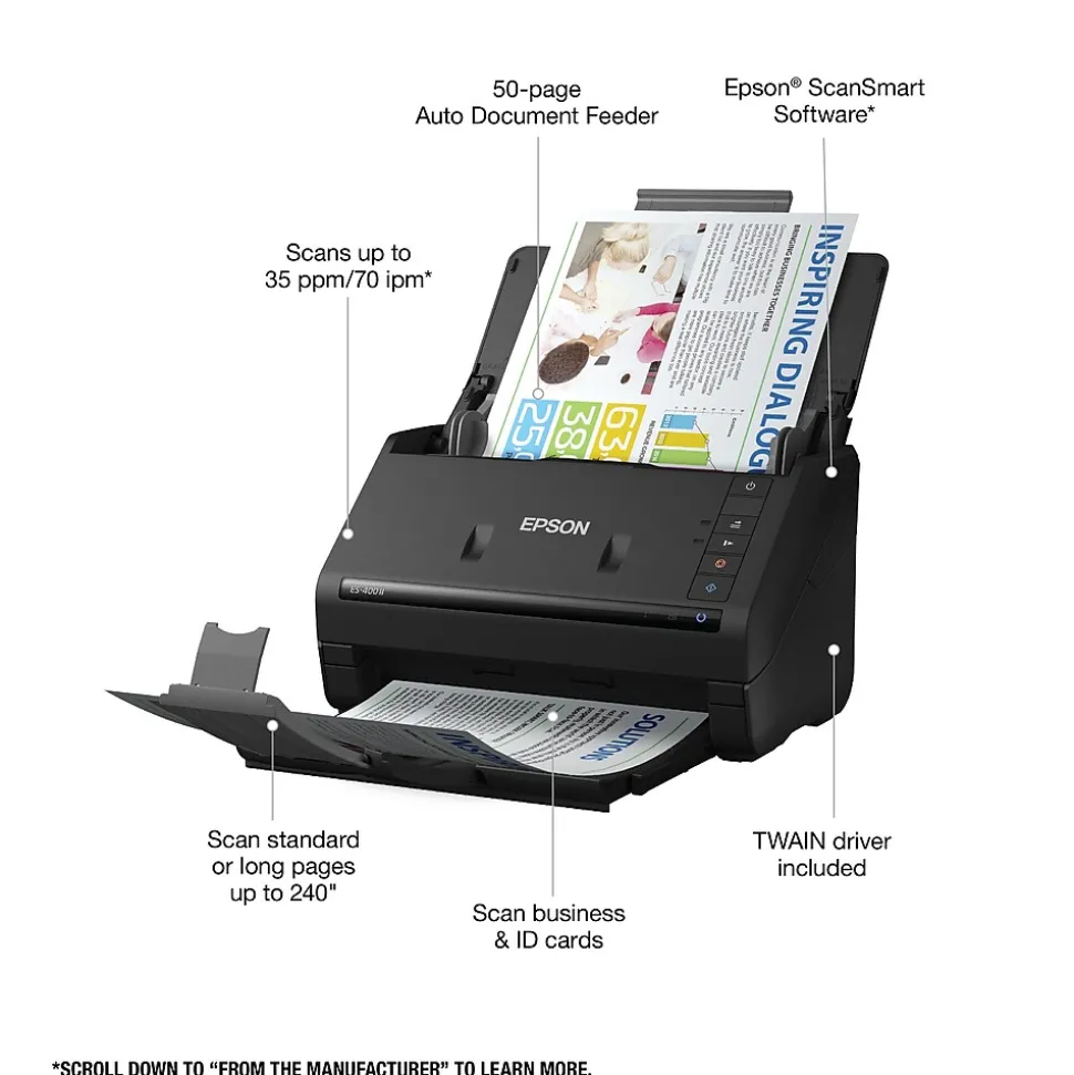 Get organized fast with the WorkForce ES-400 II duplex desktop document scanner. This reliable, easy-to-use performer speeds through scans up to 35 ppm/70 ipm, capturing both sides of each sheet in one pass. Its 50-sheet Auto Document Feeder allows you to breeze through stacks of documents of varying sizes. Intuitive Epson ScanSmart Software means you can easily preview, email and upload your scans. The included TWAIN driver ensures compatibility with most document management software. Scan to cloud storage accounts or searchable PDFs. Color and image adjustment features such as auto crop, dirt detection, staple protection and paper-skew correction help ensure remarkable image quality, whatever the scan.