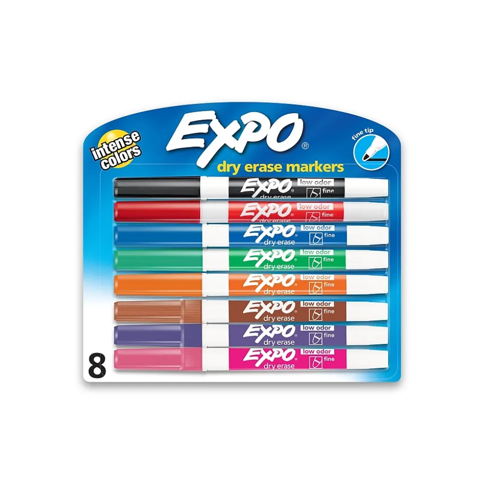 Write or draw on whiteboards or glass surfaces with these fine-tip dry-erase markers. The quick-drying, non-toxic ink is formulated to be low odor, making the markers ideal for regular use. Surfaces can be wiped clean with a dry cloth or eraser when lectures or presentations are done. Each pack of Expo low-odor dry-erase markers contains eight assorted colors for color-coding ideas.