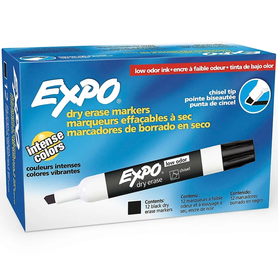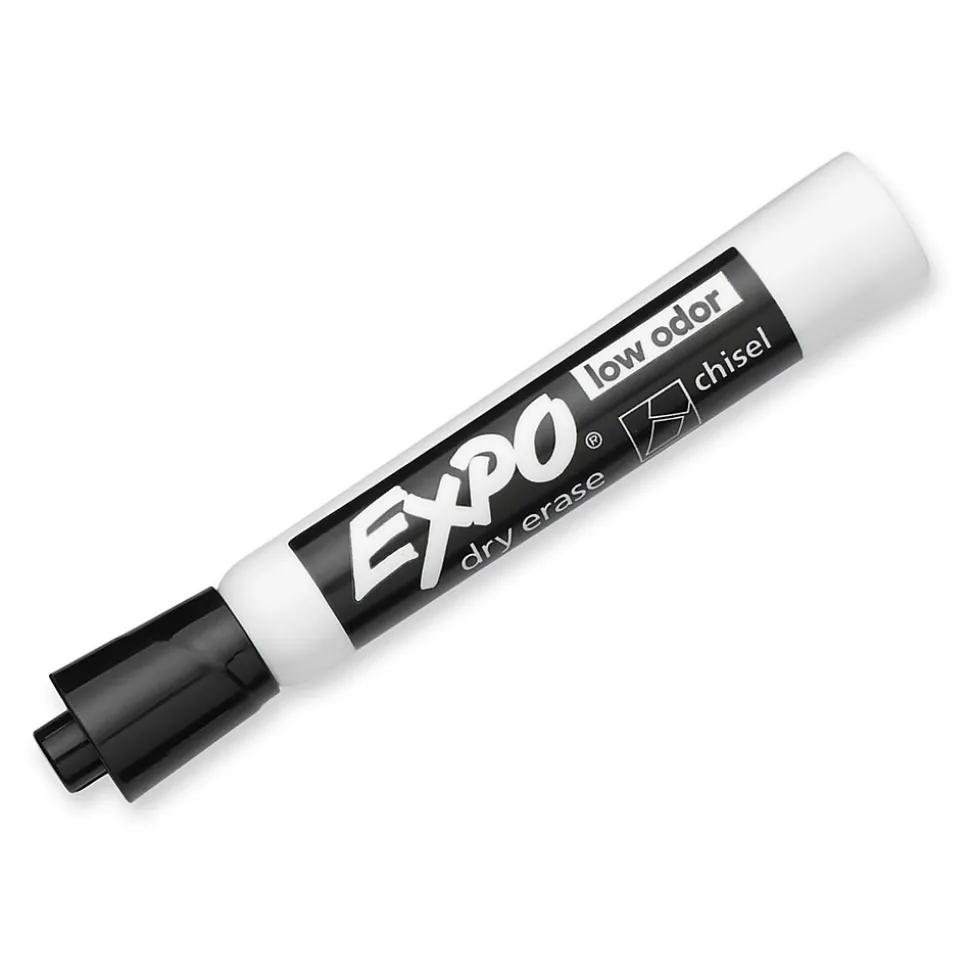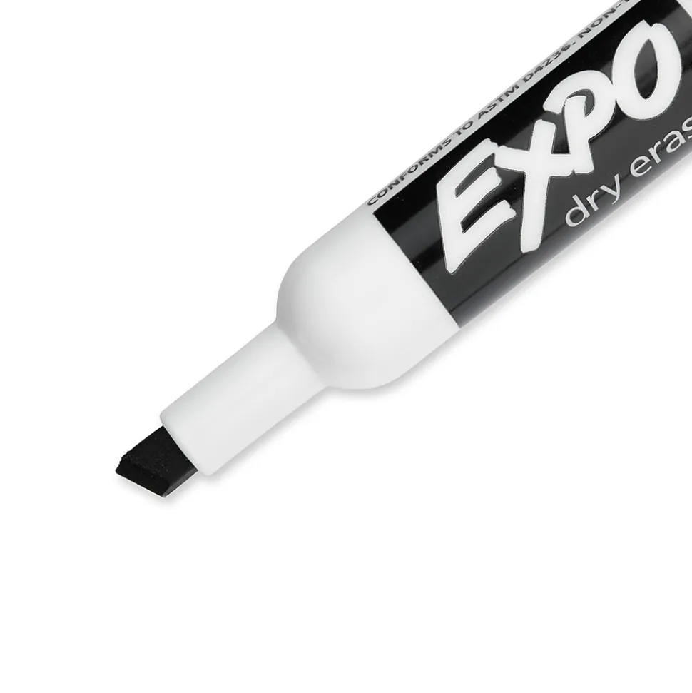 Lead group meetings or demonstrate new concepts with the help of these Expo dry-erase markers. Thick, round barrels make these markers easy to grip and the chisel tips let you choose between fine or heavy lines. These Expo dry-erase markers feature a low-odor ink, which wipes away easily without leaving a mess behind to leave whiteboards clean and ready for use.