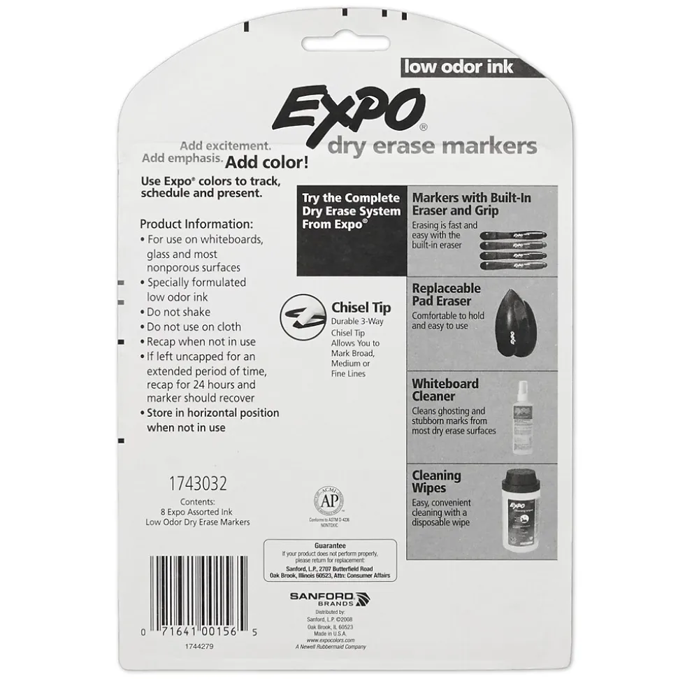 EXPO Low Odor Dry Erase Markers use a specially formulated, alcohol-based ink with virtually no odor. The chisel tip markers feature vivid ink that is quick-drying and easy to see from a distance. These dry erase markers write on whiteboards and most non-porous surfaces.