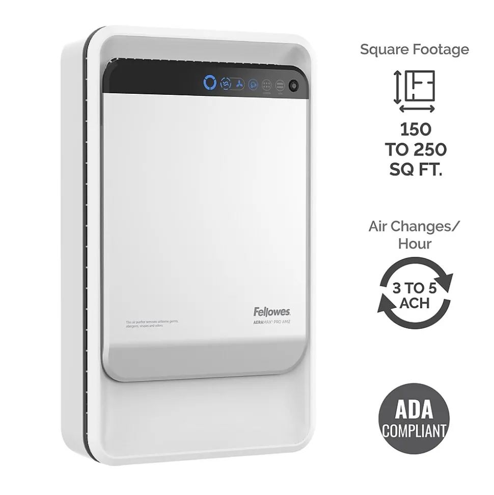 The super slim design of the Fellowes® AeraMax® Pro AM2 is 99.99% effective against coronavirus* and delivers 3-5 air changes per hour (ACH) in 150-250 square feet spaces; it’s ideal for smaller shared spaces. Proprietary and patented EnviroSmart™ technology makes AeraMax Pro the only air purifier to automatically responds to occupancy and air quality levels. The 4-stage True HEPA filtration system removes over 99% of all airborne contaminants. Fellowes® AeraMax® Pro air purifiers were demonstrated through independent laboratory testing to be effective in reducing aerosolized airborne concentration of Human Coronavirus 229E in a test chamber, reaching 99.99% airborne reduction within 1 hour of operation.