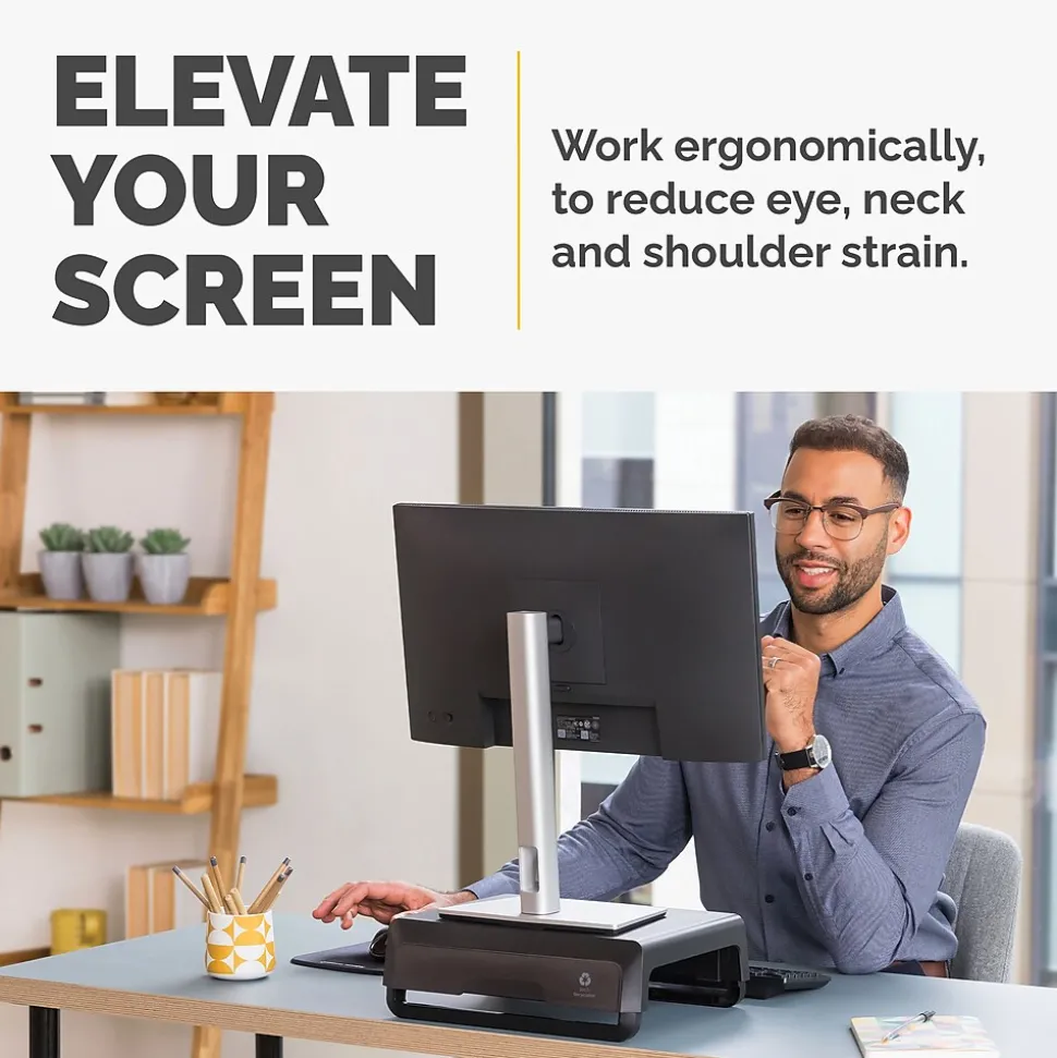 This Fellowes Breyta black monitor stand 100098502 has 3 easy to adjust height settings to encourage good ergonomic posture, promoting comfort throughout the day. Modern and simple design. Made from materials which are 100% recyclable through Fellowes take-back program. Please contact Fellowes Customer Service for more information. Made to last with extended 5-year limited warranty.