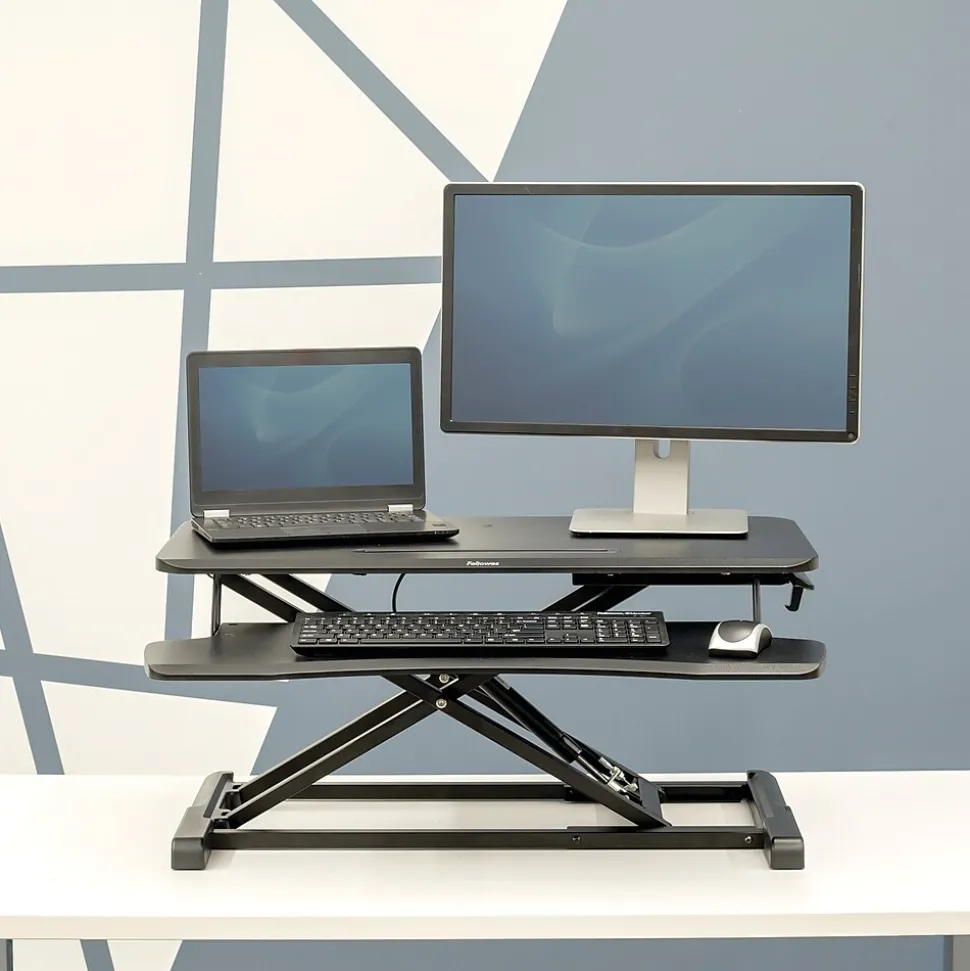 The Corsivo Standing Desk Converter allows you to change positions effortlessly while you’re hard at work. The gas spring adjustment allows for 15.5″ of height adjustment, while the built-in device channel keeps your phone or other accessories within reach. This standing desk converter is designed for durability and lasting performance – simply attach the optional keyboard platform and embrace freedom to work in the way that’s most comfortable to you.