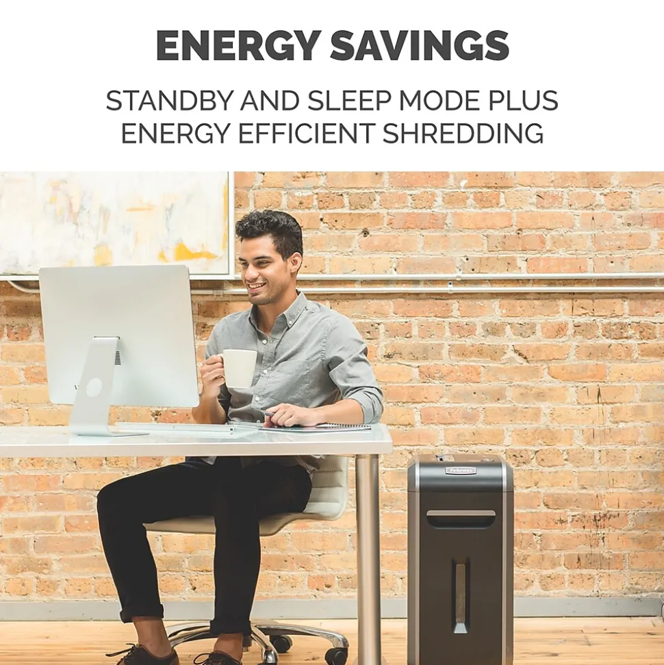 Clear your office of paper clutter without sacrificing security when you use this Fellowes PowerShred cross-cut shredder. The powerful shredding action cuts through staples, credit cards, CDs and paperclips, making it easy to get through large stacks of paperwork quickly. Jam-proof technology keeps this shredder running smoothly throughout the day, and SafeSense Technology automatically stops this shredder if your hands are close by. Shred up to 18 pages in a single pass, and use this shredder continuously for up to 30 minutes before a cool-down period is needed. With a 9-gallon pullout bin, this Fellowes PowerShred cross-cut shredder keeps paper waste contained until you’re ready to take out the trash.