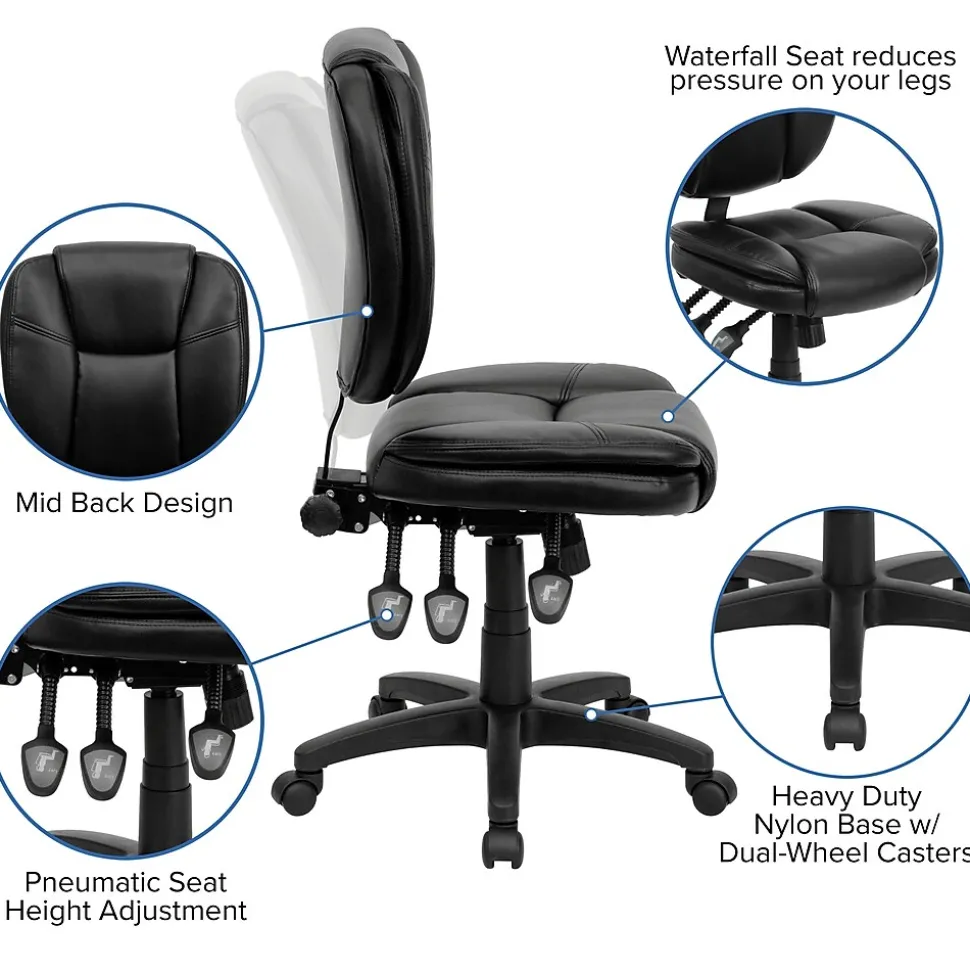 Flash Furniture Caroline Armless Ergonomic LeatherSoft Swivel Mid-Back Multifunction Task Office Chair, Black (GO930FBKLEA)