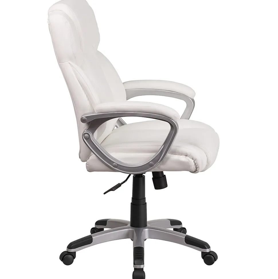 When impeccable form follows precise function the result is this black executive LeatherSoft office chair that offers a stylish appearance as well as custom comfort. The mid-back design provides support to the mid-to-upper back region. LeatherSoft is leather and polyurethane for added Softness and Durability. Turn the tilt tension adjustment knob to increase or decrease the amount of force needed to rock or recline. Lock the seat in place with the tilt lock mechanism. The waterfall front seat edge removes pressure from the lower legs and improves circulation. Chair easily swivels 360 degrees to get the maximum use of your workspace without strain. The pneumatic adjustment lever will allow you to easily adjust the seat to your desired height. The silver nylon base with black caps prevents feet from slipping when resting on chairs base. This chair will be an outstanding work from home or office chair.