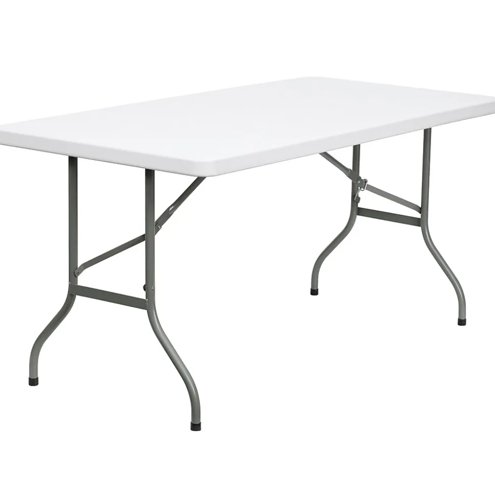 Ensure you have enough surface space for any function and take the stress out of hosting your next gathering. This rectangular folding table is 5 feet long and is beneficial in a multitude of settings that include banquet halls, conference centers, cafeterias, schools and in the home. Use as a temporary seating solution or setup for everyday use. This plastic folding table comfortably seats up to six adults while ensuring plenty of legroom. Speed up the time it takes to set-up and tear-down wedding receptions, graduation parties, banquets, buffets and other events with this folding table. Whether you’re hosting an indoor or outdoor gathering, the smooth design is easy to wipe clean. When using for outdoor events store indoors to protect the frame from extreme moisture. The table legs fold under for storage and provide better portability. This table is commercial grade to withstand everyday use in the hospitality industry.
