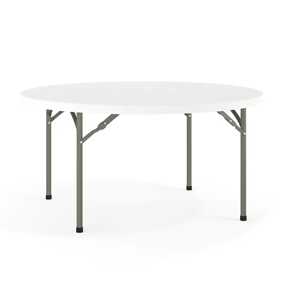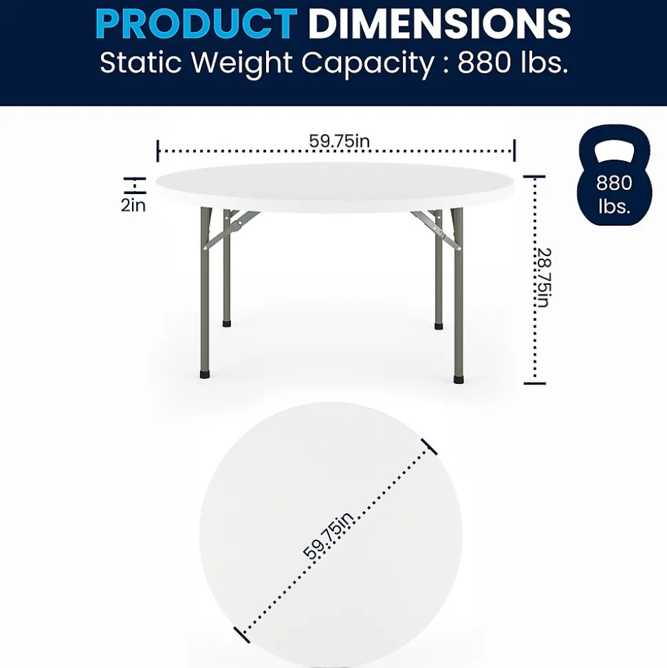 Ensure you have enough surface space for any function and take the stress out of hosting your next gathering. The round dining folding table is a great option for special event planners, catering companies and banquet facilities. This durable, easy to clean table is commercial rated for use in banquet halls, convention centers and at trade shows. Use during game night, dress it up for holiday parties, and coordinate crafts night. The thick, granite white tabletop is 60″ in diameter, 2″ thick, and will comfortably seat up to 8 adults. Its waterproof, impact and stain resistant top have a 880 pound static load capacity. Attractive gray powder coated legs lock securely in place while in use and non-marring floor caps protect your floor by sliding smoothly when you need to move the table. Designed for both indoor and outdoor use, store table indoors and protect the frame from extreme moisture. The 60″ Round Granite White Plastic Folding Table is a convenient option for your next home, school or business event.