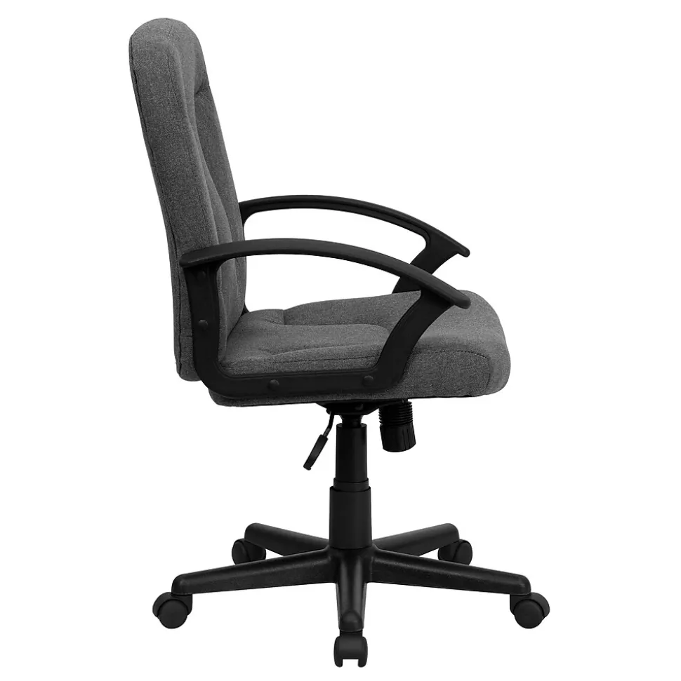 Get comfortable in this office chair while you check off the items on your “To-Do” list. The swivel seat is padded with 5″ of foam and the chair is covered with gray fabric upholstery. Nylon armrests take pressure off your shoulders and neck. Use the tilt tension adjustment knob to increase or decrease the amount of force needed to rock and recline. Lock the position in place with the tilt lock mechanism. Raise and lower your seat height with the pneumatic seat height adjustment lever, conveniently located below the seat. The heavy-duty, nylon base with dual wheel casters makes it easy to roll across the floor. When you want a great home or office chair, offering comfort, style and functionality, this attractive office chair is a great choice.