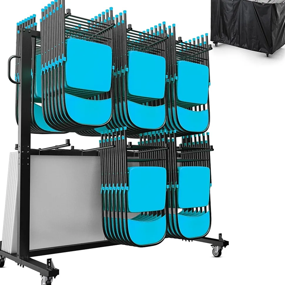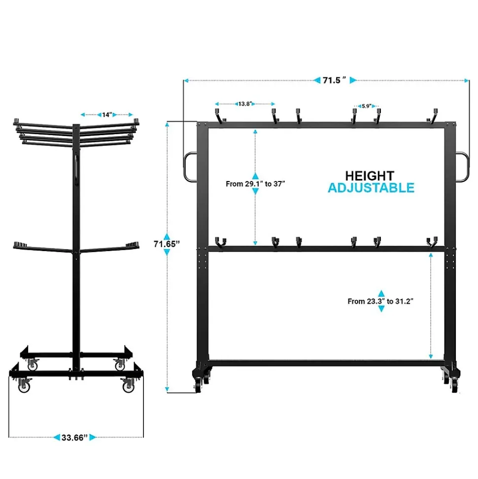 Set up and cleanup for special events, training seminars, or Sunday services can be a monumental task but this innovative mobile chair and table dolly is here to help. Designed with dual wheel casters that perform on any type of flooring surface, this mobile cart can turn 360° to save you steps when loading and unloading your folding chairs and tables. The powder coated steel frame holds up to 660 lbs. static weight and boasts a height adjustable middle crossbar and steel handles for easy movement. Dual chair hangers and lower brackets give you the versatility of holding up to 84 chairs or 42 chairs and 12 tables depending on the chair type. The included bungee cords wrap around the upper and lower sections to ensure your load stays in place and the weatherproof cover lets you safely store your tables and chairs outdoors when you’re tight on indoor space.