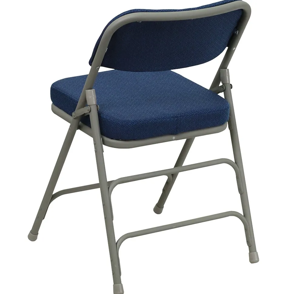 Ensure that your guests, clients, or parishioners pay more attention to you than the clock with this ultra-comfortable folding chair. This folding chair is a practical choice for social activities and everyday use in the home due to its compact storage capabilities. This metal folding chair is commercial-grade to withstand heavy and daily usage in any industry. Take your regular group meetings outdoors instead of staying in a stuffy room, or host beautiful outdoor events with the help of this padded folding chair. While suitable for outdoor use, the chair should be stores indoors to protect the frame from extreme moisture. Its 18-gauge triple-braced curved steel frame supports up to 300 pounds while the nonmarring floor glides protect your flooring from scuffs and scrapes. The uses are endless with this multipurpose chair to fulfill your seating needs for your business or home. With nothing to assemble. this chair comes ready to service your needs.