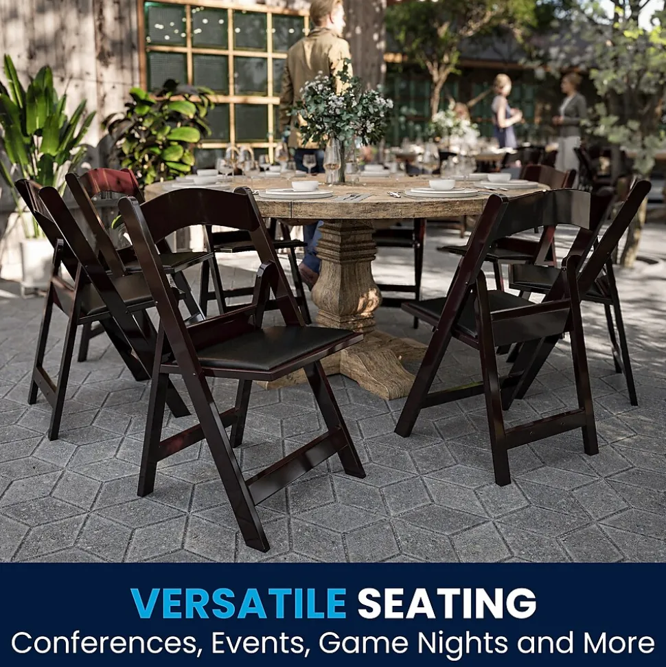 Commercial-grade resin folding chair with an upscale design making it the perfect special event chair. This product is engineered and built with premium materials that will withstand heavy duty use for event, business and home usage. These folding chairs will stack easily and feature a washable vinyl seat that can be replaced if damaged. Choose the color option that would best pair with your event needs. This is a commercial-grade, on-demand seating solution ideal for more formal occasions such as weddings, catered events or anniversary parties. Folding Chair Highlights: – Ready-to-use with no assembly required – Hassle free stackable storage – Replaceable seat prolongs the life of the chair – Floor caps to prevent surface and flooring damage – 1000LB weight capacity – These low-maintenance party event chairs wipe down easily after luncheons and stack neatly for storage or floor maintenance. Make a smart investment by purchasing multiple resin folding chairs for your rental business, banquet facility or event venue. Purchase our folding chair dolly for quick and easy set up and take down.