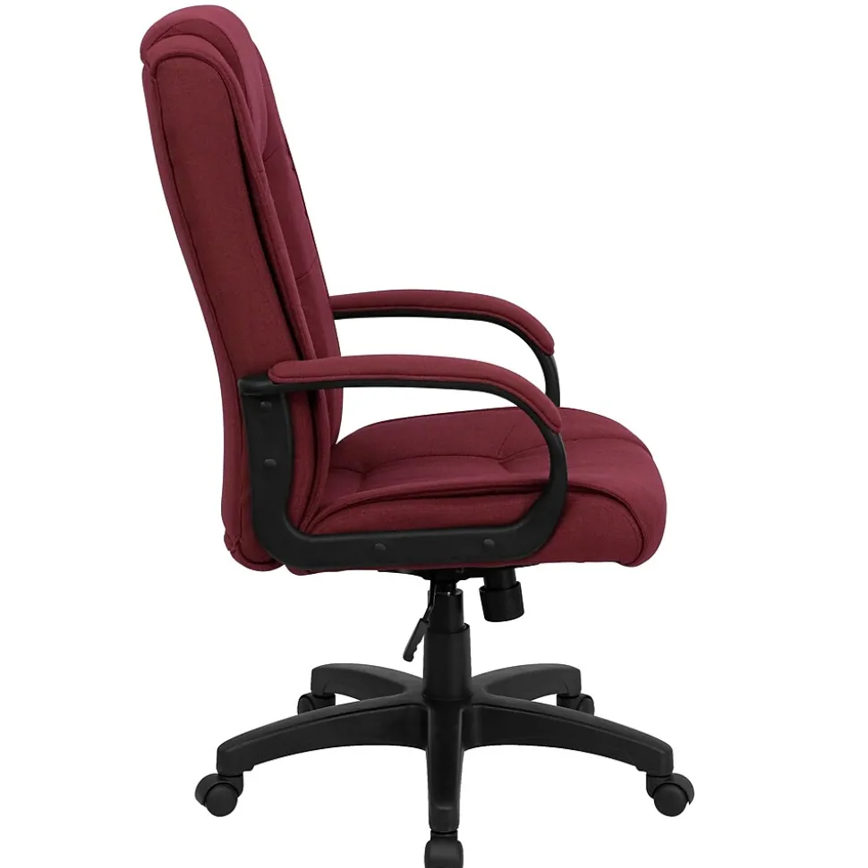 Whether you’re powering through your workday or just browsing the internet, this executive swivel office chair is just what you need. Featuring burgundy fabric upholstery, built-in lumbar support and a contoured back and seat, this high back chair is perfect for your office or home office. High back office chairs have backs extending to the upper back for greater support. The high back design relieves tension in the lower back, preventing long term strain. The contoured seat dissipates pressure points for greater comfort. The tilt lock mechanism rocks/tilts the chair and locks in an upright position while the tilt tension adjustment knob adjusts the chair’s backward tilt resistance. Chair easily swivels 360 degrees to get the maximum use of your workspace without strain. The pneumatic adjustment lever will allow you to easily adjust the seat to your desired height.