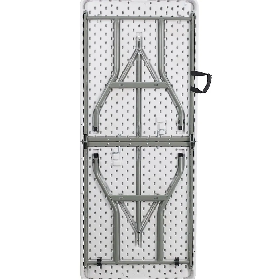 Advertise your business and products at the Expo on this portable folding table. This 6′ long banquet table accommodates up to 8 people and seats extra guests during holiday gatherings. Built for commercial use this heavy-duty folding table makes appearances in restaurants, warehouses, schools, churches and rec centers. Folding tables can be used for all your sit-down activities and their legs lock when folded for storage. This versatile centerfold table can be dressed up during holiday events and parties. If you have hard flooring at your banquet hall the floor caps prevent scratches and glide smoothly across floors. Easy to clean and store, plastic folding tables are the best option for any occasion. Although designed for indoor events this party table can be used outdoors on the patio during good weather but must be stored indoors. Get your ready to use rectangular folding table for your home or business today.