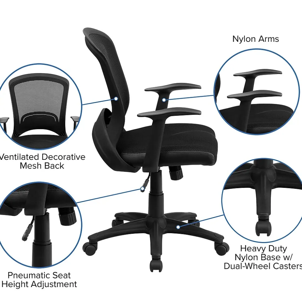 This decorative black mesh back office chair provides you the basic function needed to complete your everyday tasks at work or home. Mid-back office chairs are the logical choice for performing an array of tasks. A mid-back office chair offers support to the mid-to-upper back region. The contoured seat dissipates pressure points for greater comfort. Chair easily swivels 360 degrees to get the maximum use of your workspace without strain. The pneumatic adjustment lever will allow you to easily adjust the seat to your desired height.