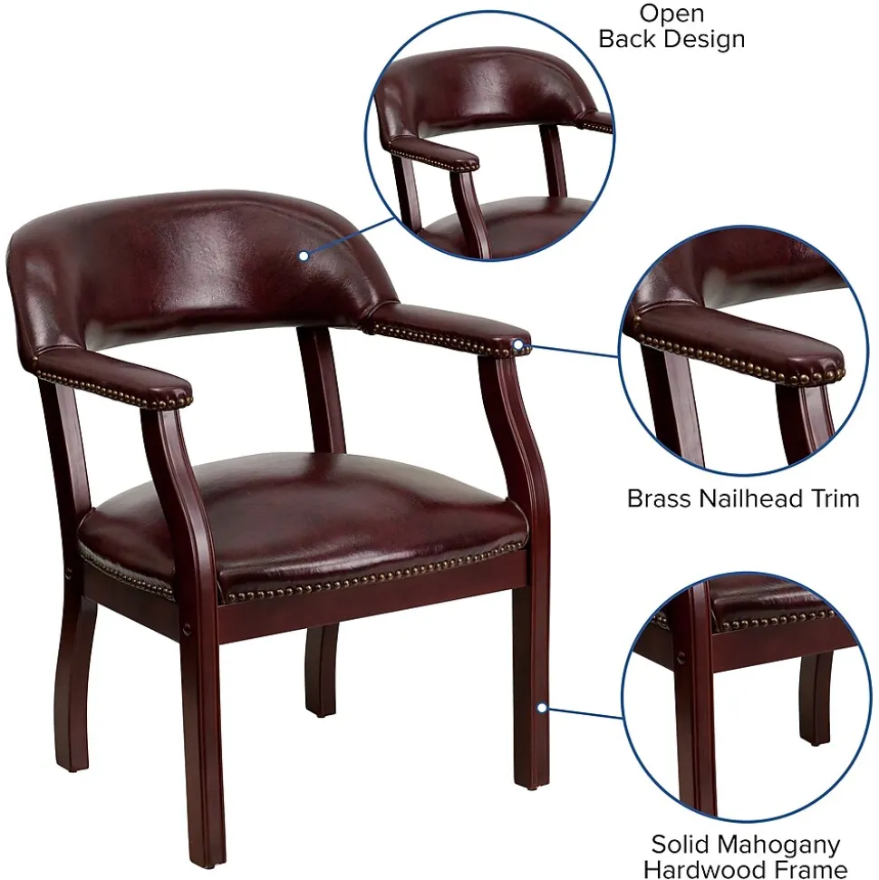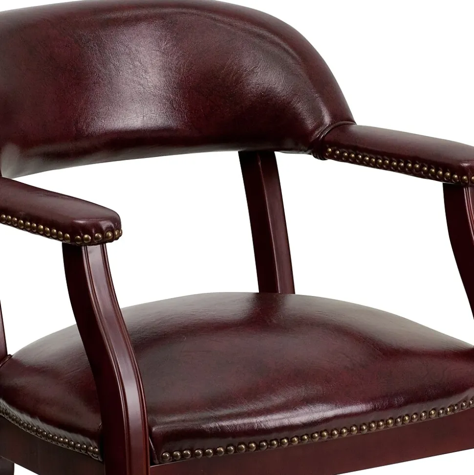 Create an upscale seating area for your private office or waiting room with this Flash Furniture wood conference office chair. Durable vinyl upholstery withstands everyday wear and tear while still maintaining its lustrous sheen, and the rich oxblood color brings traditional style to your space. This chair features a solid hardwood mahogany frame, providing long-lasting durability and a hint of sophistication. The padded seat and seat back ensure comfort during long meetings and consultations, while the fixed armrests feature extra padding to support your arms and shoulders. With a classic silhouette and nailhead trim accents, this Flash Furniture wood conference office chair makes a striking addition to your office furniture collection.