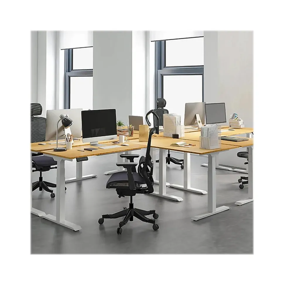 The FlexiSpot E7 is an L-shaped height-adjustable desk with white base and bamboo top. Powered by three motors, the desk can support up to 330 lbs. and travel at 1.5″ per second. Holeless columns are not just attractive, but also prevent the buildup of grease on the moving stages. The anti-collision feature reverses the direction of the desk if an object is struck during movement.