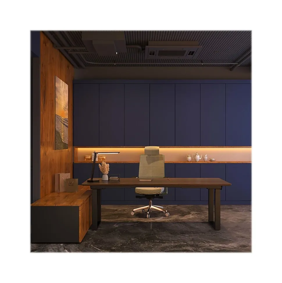 The FlexiSpot E7Q Odin executive desk is a great solution for small conference rooms, huddle rooms, and collaboration areas. It also makes an amazing home office desk. The E7Q features a four-motor height-adjustable base that can support up to 440 lbs. The desk’s holeless columns are not only attractive but prevent the buildup of grease on the moving stages. The anti-collision feature reverses the direction of the desk if an object is struck during movement.