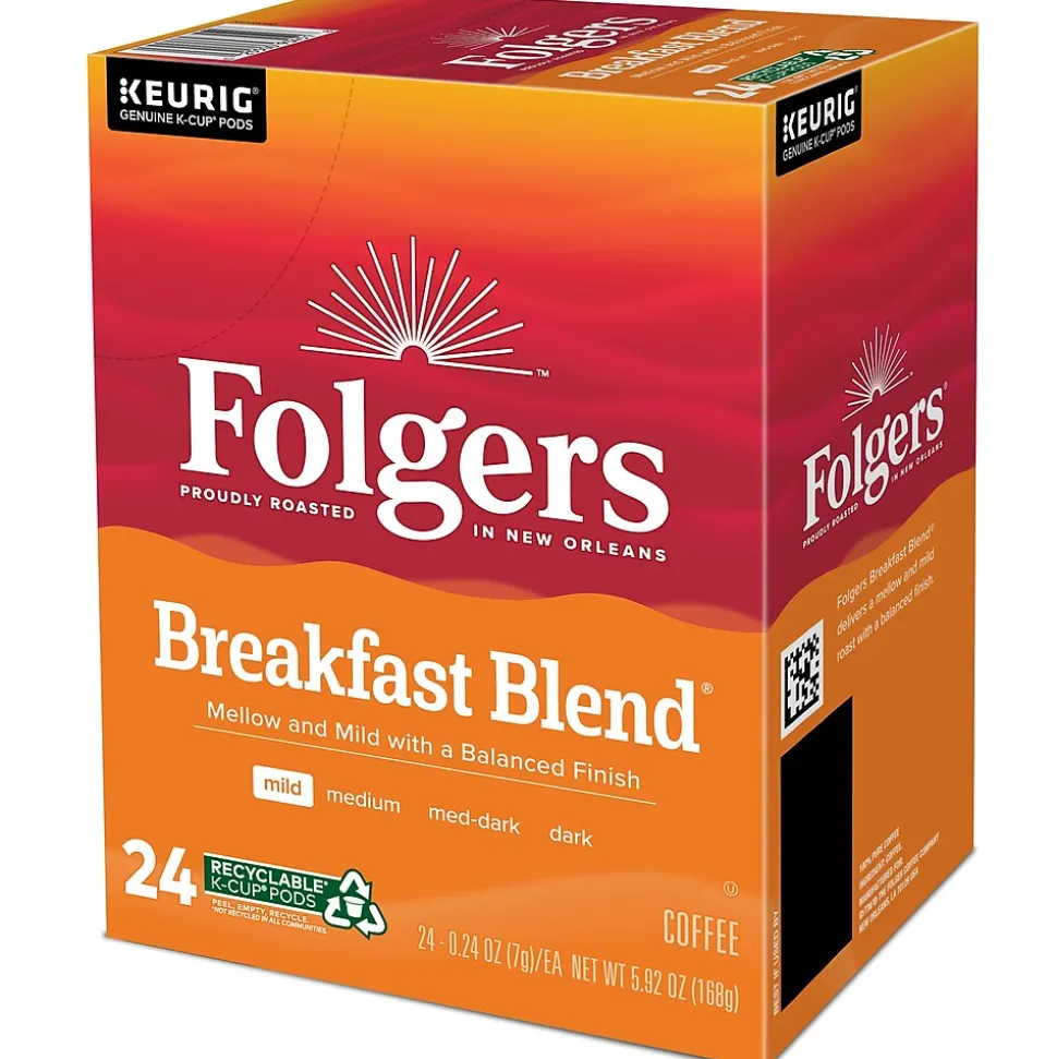 Folgers Breakfast Blend K-Cup coffee pods feature a light roast and mild taste for a clean, invigorating finish that lingers and with 24 pods in each pack, there’s plenty for everyone in the department.